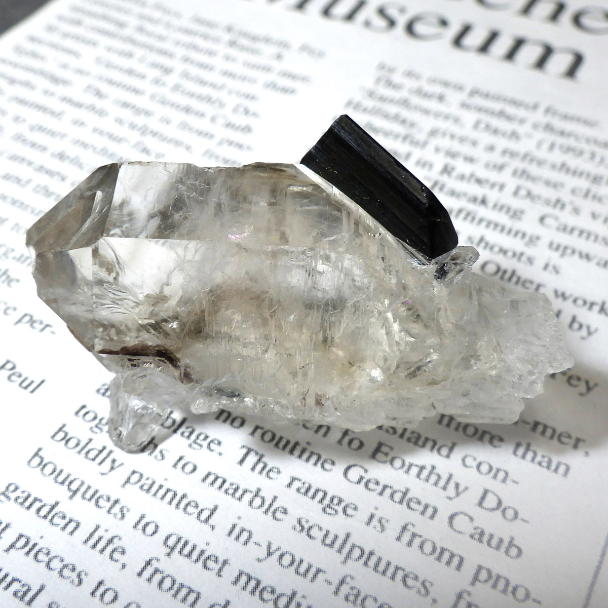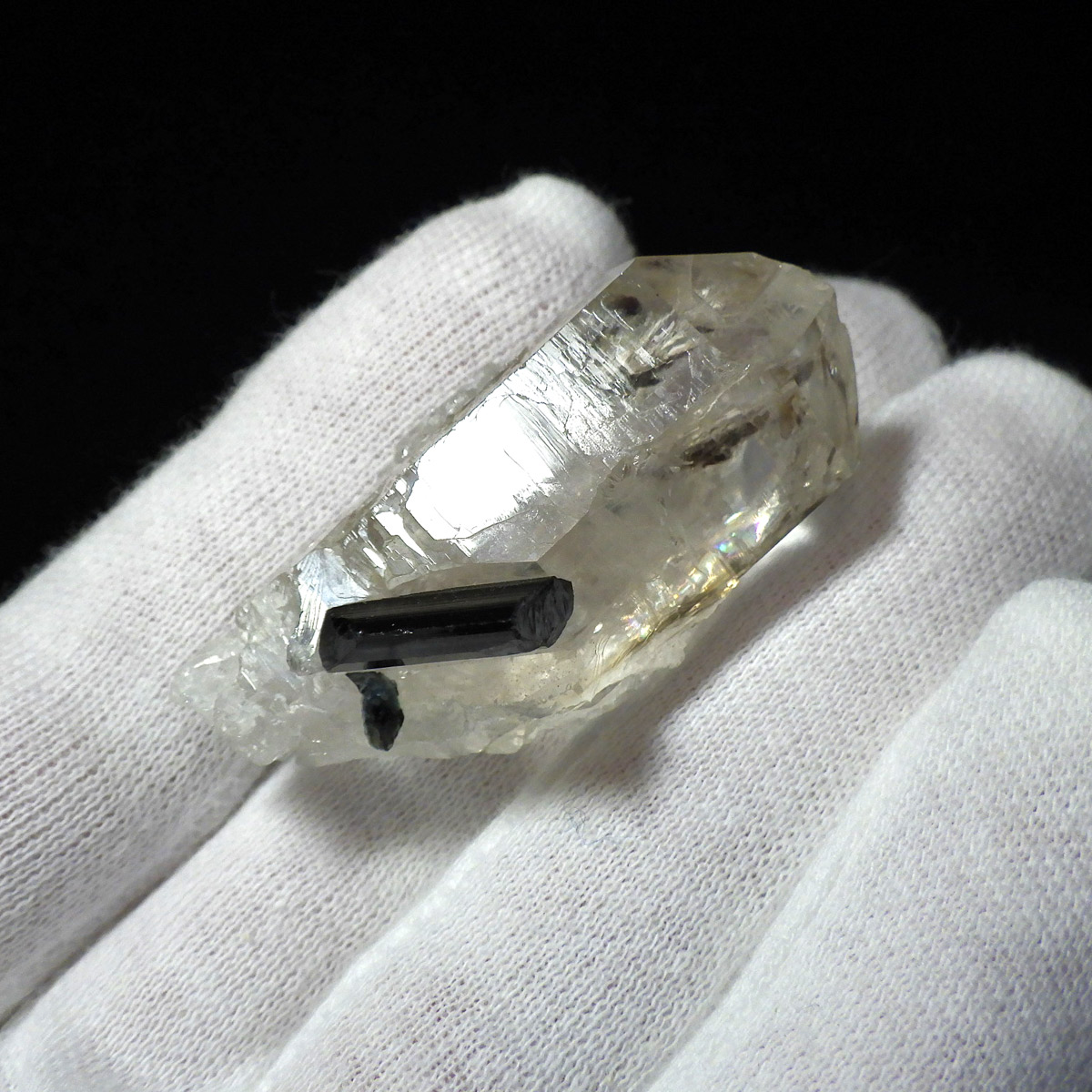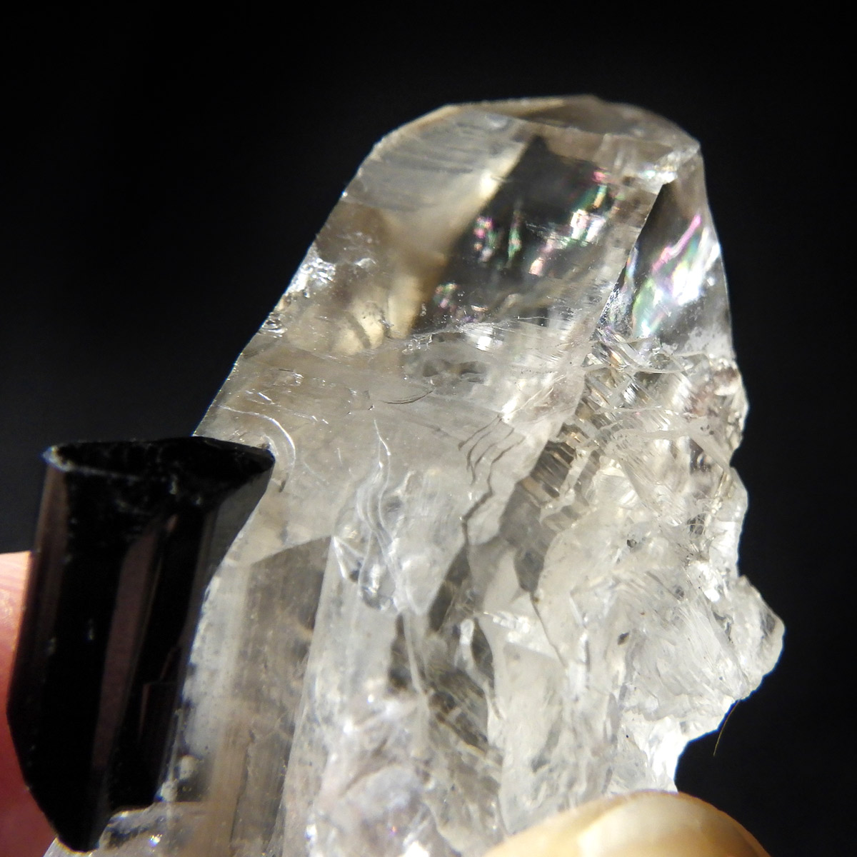 透明度の高い美しい水晶に、黒く輝くブラックトルマリンが共生した、ブラジル産の高品質な原石標本です。 水晶は見事な六角柱結晶を形成しており、その先端付近には自然が作り出した虹(レインボー)が繊細に浮かび上がります。これは内部の微細なクラックに光が反射・屈折することで生まれる現象で、標本の透明度と純度の高さを物語っています。ブラックトルマリンは深みのある漆黒の色合いと素晴らしい光沢を放ち、透明なクォーツとのコントラストは圧巻。両鉱物ともに結晶面に自然なツヤがあり、シャープで洗練された印象を与える極めて美しい共生標本です。