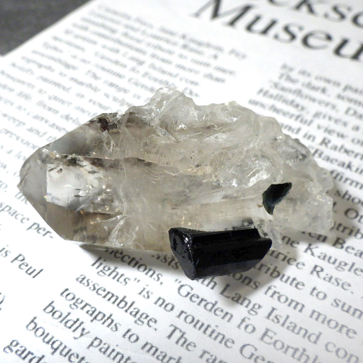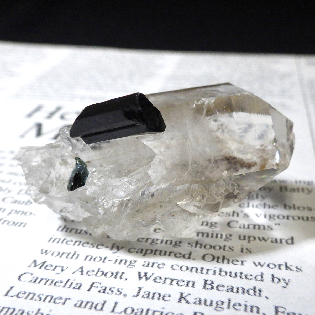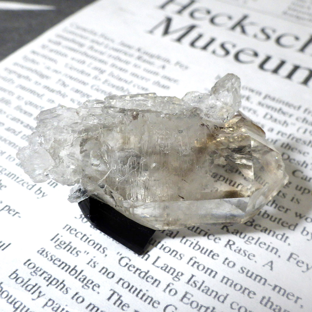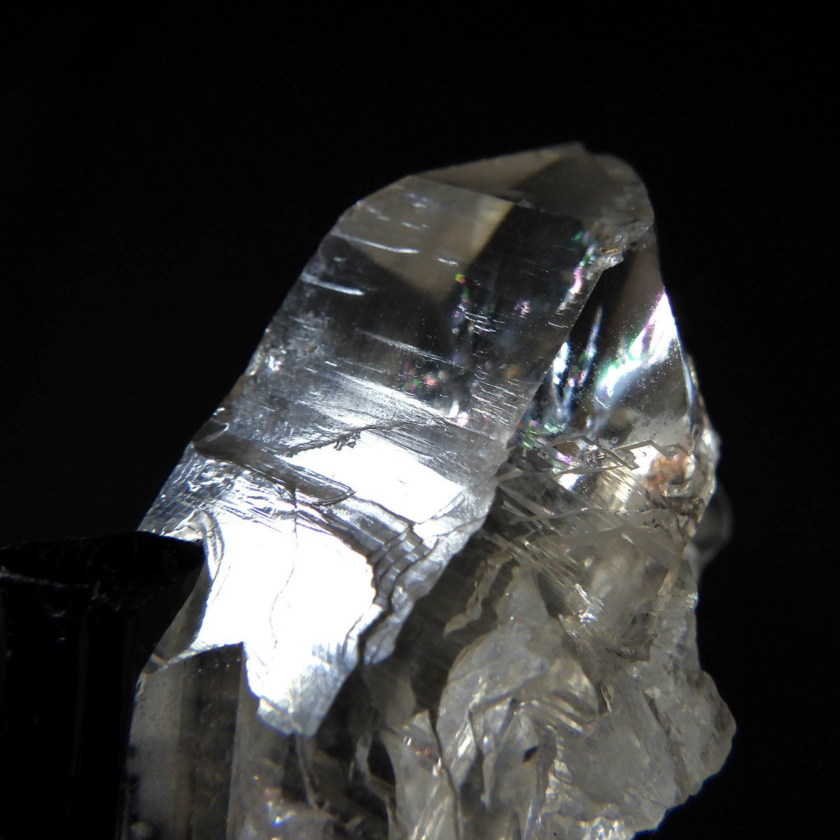 透明度の高い美しい水晶に、黒く輝くブラックトルマリンが共生した、ブラジル産の高品質な原石標本です。 水晶は見事な六角柱結晶を形成しており、その先端付近には自然が作り出した虹(レインボー)が繊細に浮かび上がります。これは内部の微細なクラックに光が反射・屈折することで生まれる現象で、標本の透明度と純度の高さを物語っています。ブラックトルマリンは深みのある漆黒の色合いと素晴らしい光沢を放ち、透明なクォーツとのコントラストは圧巻。両鉱物ともに結晶面に自然なツヤがあり、シャープで洗練された印象を与える極めて美しい共生標本です。