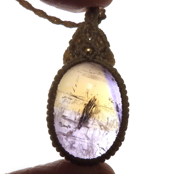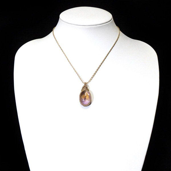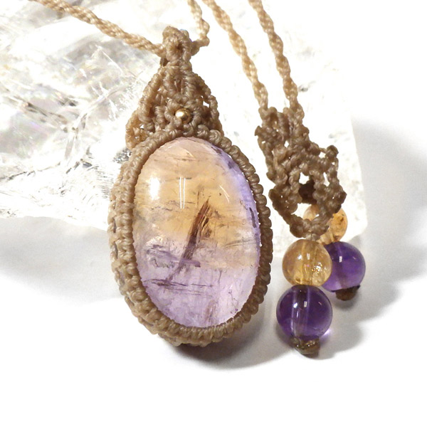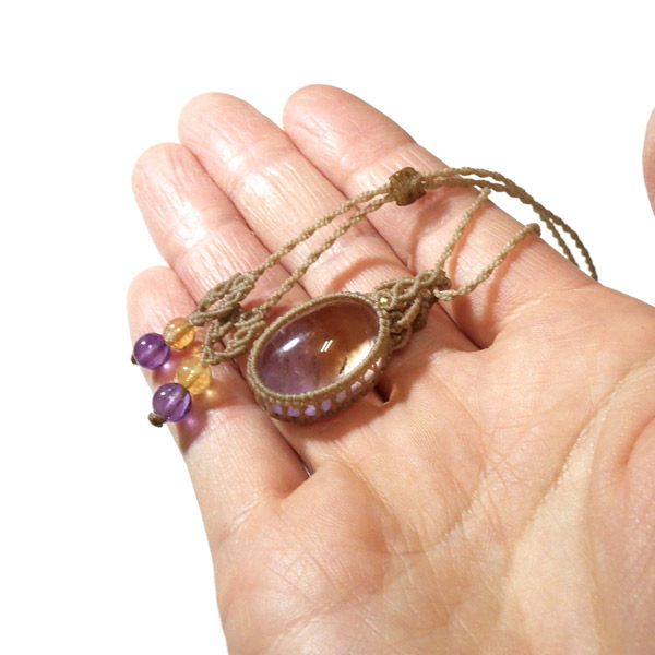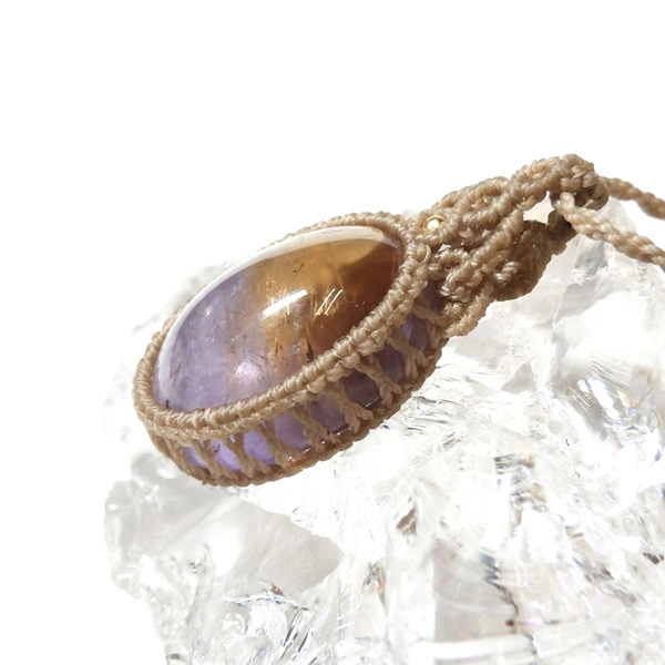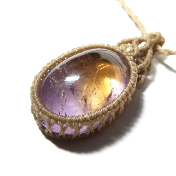 アメジストとシトリンがひとつに溶け合った、美しい色彩が魅力のボリビア産アメトリンを使用したマクラメペンダントです。透明感あふれるぷっくりとしたフォルムに、光を受けてきらめくアメトリンが幻想的な輝きを放ちます。