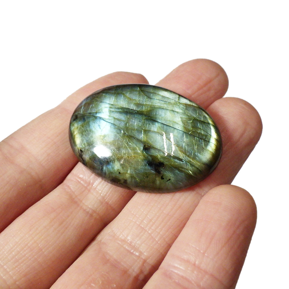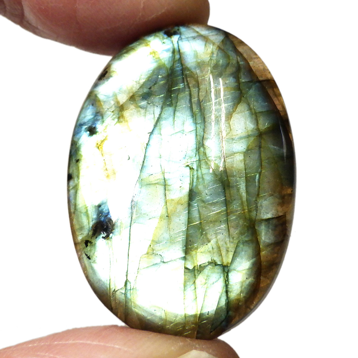 ラブラドライトの美しい天然石ルースです。 ラブラドライトは見る角度によってオーロラのような色彩を変える美しい光を持つのが特徴です。 石自体はグレーなどの地味めな色合いをしていますが、そこに鮮やかな輝きが浮かび上がるところから「アゲハ蝶の羽」に例えられる事もある美しい石です。 ラブラドライトは、月・太陽を象徴するといわれています。根気強い実行力を養い、信念を貫けるよう導く力があるとされます。そして、直感力・洞察力・創造性を高めてくれるでしょう。自信を失いかけた時に、生まれた意味・生きる意味を気づかせるサポートをしてくれ、生きる力を引き出してくれるといわれています。