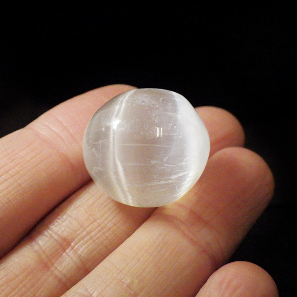 モロッコ産の艶が良いAAAセレナイトのタンブルです。 ジプサム(石膏)の透明度が高いものを、セレナイト(透石膏)といいます。大きく美しい結晶はかつて「聖母マリアのガラス」と呼ばれ、窓ガラスに利用されることもあったそうです。マットな質感が特徴的で、セレナイトのシルキーな光沢が幻想的です。 水分や油脂が苦手な石なので、取り扱いには注意が必要です。