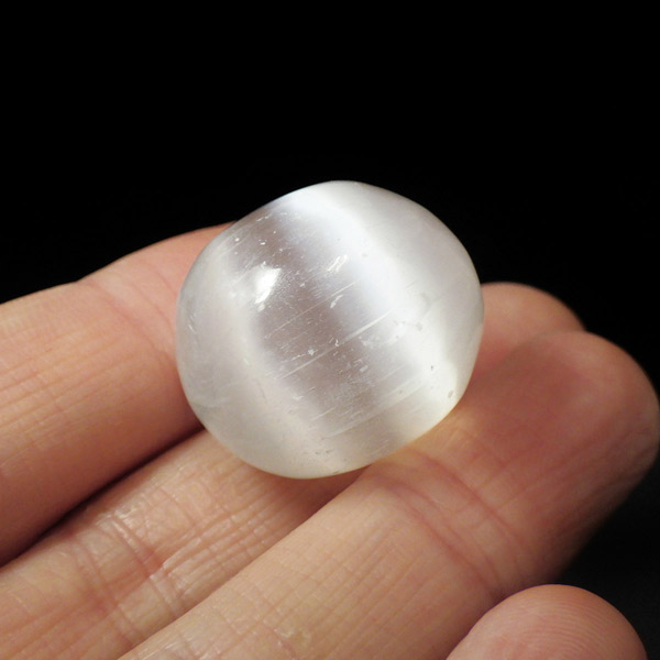 モロッコ産の艶が良いAAAセレナイトのタンブルです。 ジプサム(石膏)の透明度が高いものを、セレナイト(透石膏)といいます。大きく美しい結晶はかつて「聖母マリアのガラス」と呼ばれ、窓ガラスに利用されることもあったそうです。マットな質感が特徴的で、セレナイトのシルキーな光沢が幻想的です。 水分や油脂が苦手な石なので、取り扱いには注意が必要です。