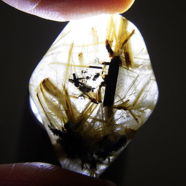 ブラジル産のルチルクォーツにヘマタイトが共生した、希少なタンブルです。 水晶の中に、黄金色に輝く針状ルチルが美しく内包され、さらにヘマタイトのメタリックな光沢が加わることで、ひとつの石とは思えないほど複雑で奥深い表情を楽しめます。ルチルの放射状の広がりが太陽放射ルチルやヘマタイトルチルとも呼ばれ、力強いエネルギーを象徴するとされています。ルチルクォーツの金運はもとよりヘマタイトの勝利・成功などの意味合いからビジネスのお守りとして良いかもしれません。
