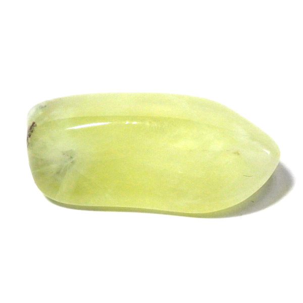 オーストラリア産のイエロープレナイト、タンブルです。和名でぶどう石(葡萄石)と呼ばれており、プレナイトの多くはぶどうの房のような形状で産出します。プレナイトと言えば、和名で「ぶどう石」と呼ばれるようにマスカットカラーが特徴の石ですが、ビビッドなイエローのプレナイトは大変希少です。皮を剥いたみずみずしいぶどうのような、シャインイエローの美しいタンブルです。