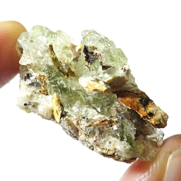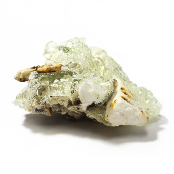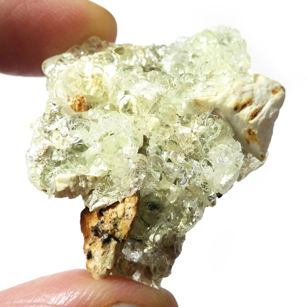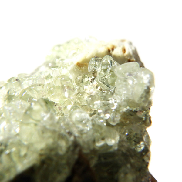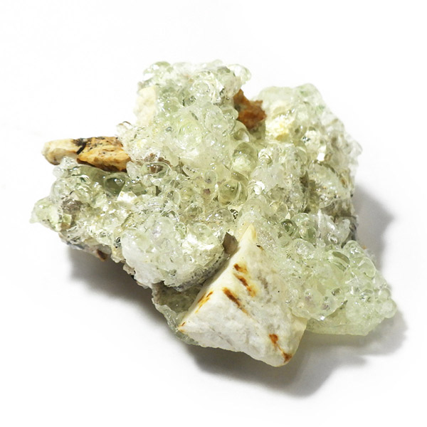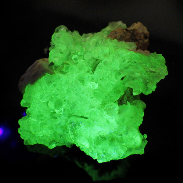 ナミビア産のハイアライトオパール原石です。ハイアライトの和名は玉滴石(ぎょくてきせき)で、オパールの一種です。地下水に溶けた二酸化ケイ素が常温で葡萄状の水滴のように固まってできた天然鉱物です。表面はモコモコとした質感で、丸玉のような可愛らしい形状が特徴。自然が作り出したとは思えないユニークなフォルムが魅力的です。紫外線ライト(長波365nm)でグリーンの強い蛍光性を示します。