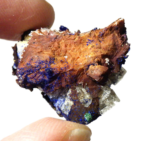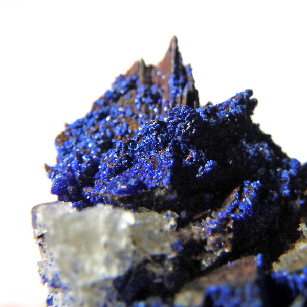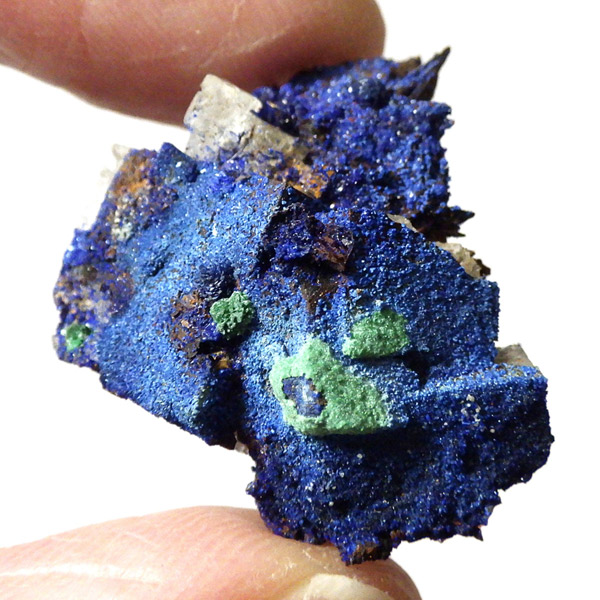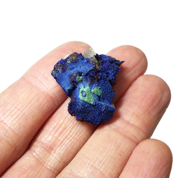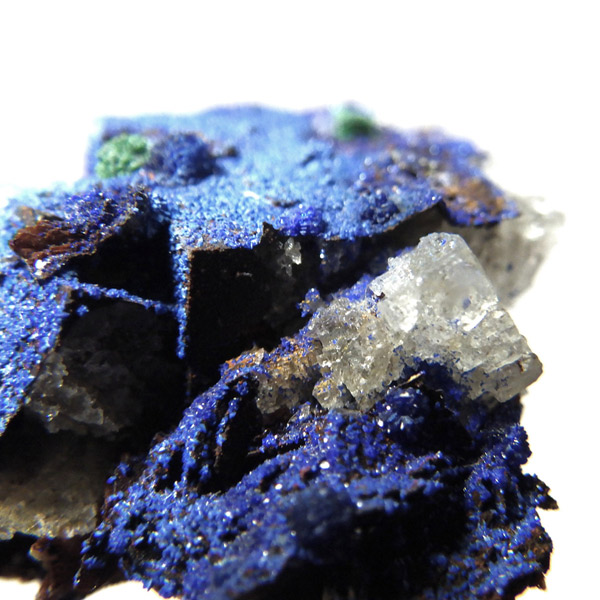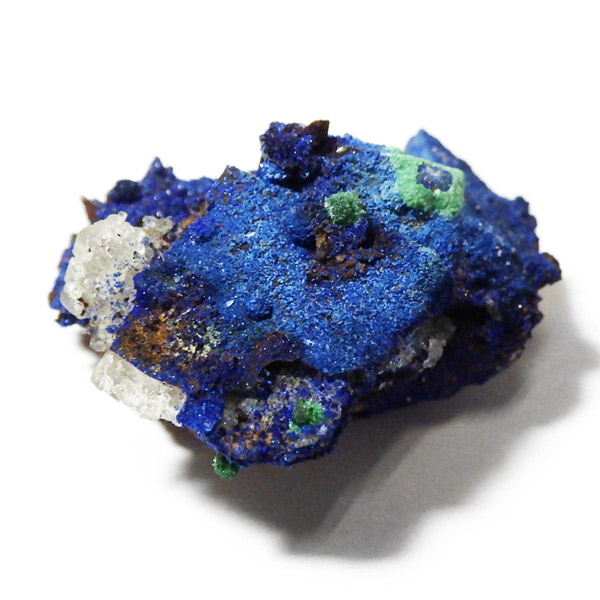 モロッコ産のアズライト結晶原石です。アズライトは産出量が少なく、鉱物コレクターの間でも非常に人気の高い希少石。中でもモロッコ産は、深く濃いブルーと美しい結晶構造を持つことで知られ、その美しさは世界トップクラスと評されています。バライト上にアズライトが結晶化されており、一部、鮮やかなグリーンのマラカイトとの共生も見られます。見る角度によってキラキラと表情を変える群青色の輝きは、まさに自然が生み出した芸術品です。