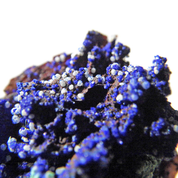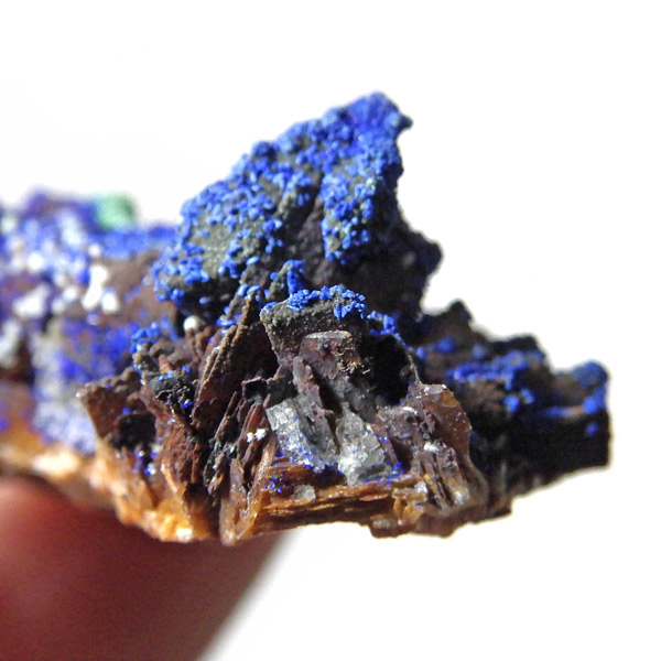 モロッコ産のアズライト結晶原石です。アズライトは産出量が少なく、鉱物コレクターの間でも非常に人気の高い希少石。中でもモロッコ産は、深く濃いブルーと美しい結晶構造を持つことで知られ、その美しさは世界トップクラスと評されています。バライト上にアズライトが結晶化されており、一部、鮮やかなグリーンのマラカイトとの共生も見られます。見る角度によってキラキラと表情を変える群青色の輝きは、まさに自然が生み出した芸術品です。