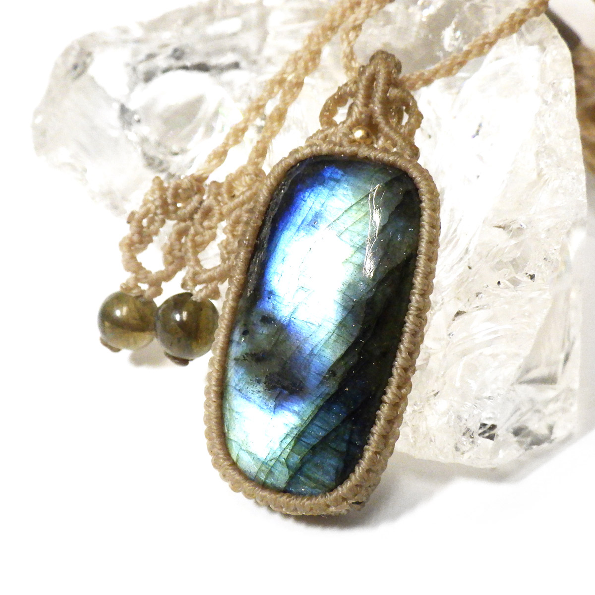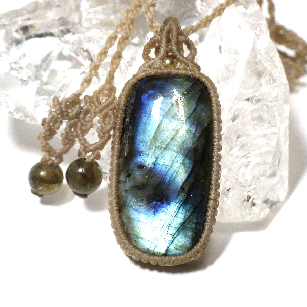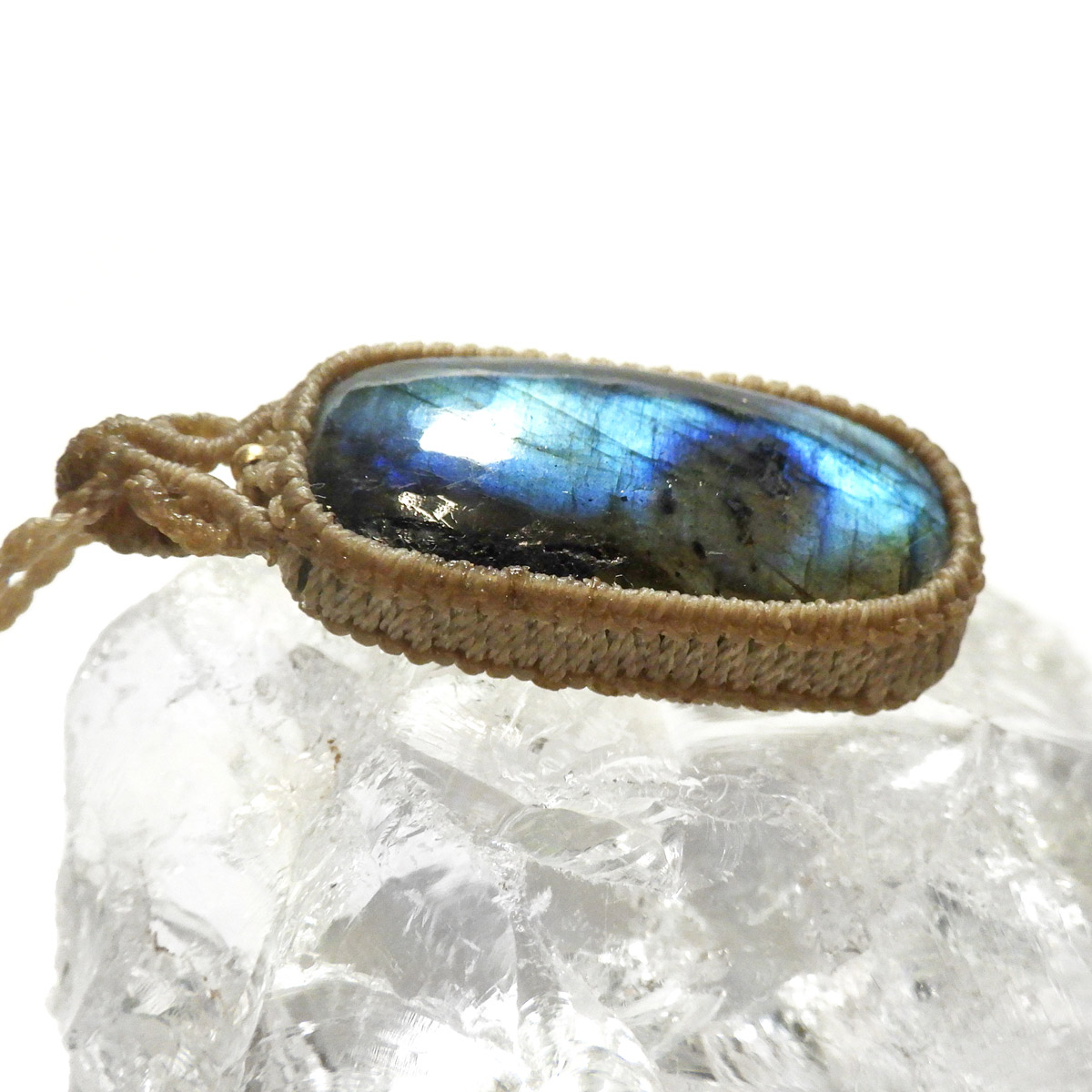 マダガスカル産のラブラドライトを使用したマクラメペンダントです。 ラブラドライトは、角度によって全面が美しく輝き、ブルーやイエローなど多彩なシラー(遊色効果)を楽しめます。 石の魅力を引き立てるよう、紐には明るめなベージュを採用。 カジュアルにもナチュラル系ファッションにも合わせやすい、大人の雰囲気漂う一点物アクセサリーです。