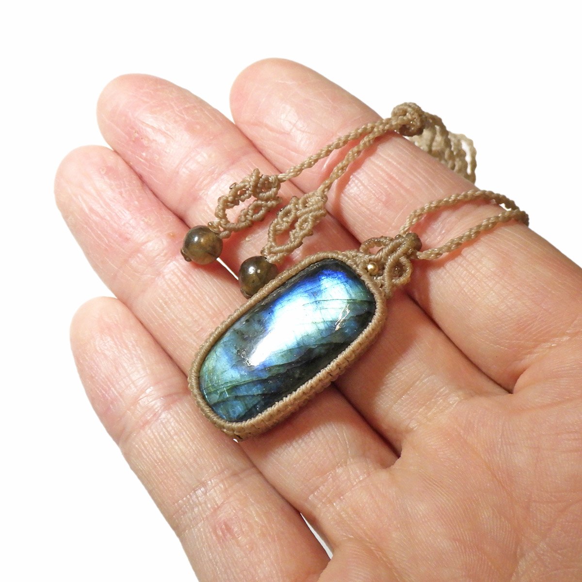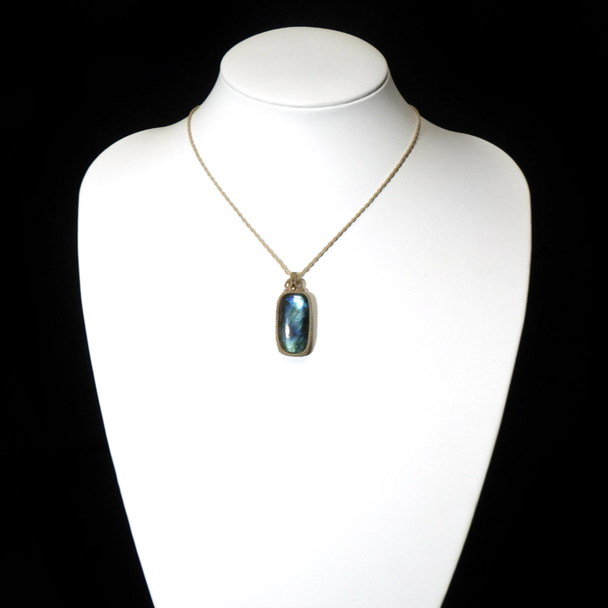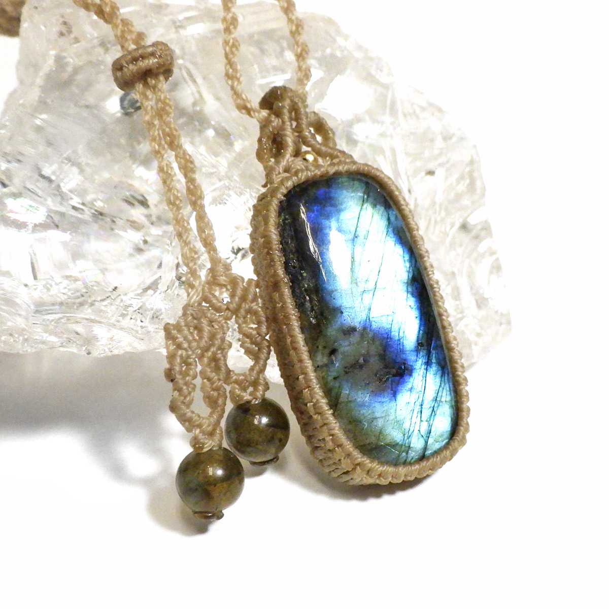 マダガスカル産のラブラドライトを使用したマクラメペンダントです。 ラブラドライトは、角度によって全面が美しく輝き、ブルーやイエローなど多彩なシラー(遊色効果)を楽しめます。 石の魅力を引き立てるよう、紐には明るめなベージュを採用。 カジュアルにもナチュラル系ファッションにも合わせやすい、大人の雰囲気漂う一点物アクセサリーです。