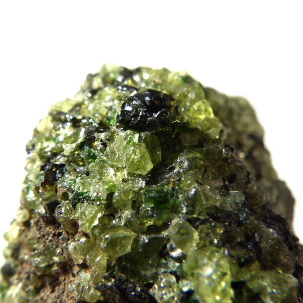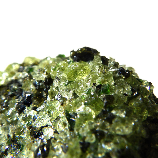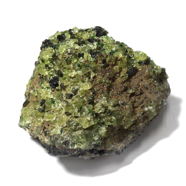 アメリカ・アリゾナ州産のペリドット母岩付き原石です。鉱物名をオリビンと呼ぶのですが、日本では宝石名のペリドットが浸透しています。和名は橄欖(かんらん)石といいます。主にグリーンの結晶がかんらん石でチャコールグレーの母岩が玄武岩です。かんらん石は月の岩石や石質隕石、石鉄隕石にも含まれており、鉄の含有量によって、白色から黒色まで色調が変化します。かんらん石は地球の上部マントルの主要構成鉱物でマグマの噴火によって溶岩の塊に運ばれて地表に出てきます。まさにその姿を切り取ったようなこの原石は、様々な濃淡の結晶が多面にわたり観察できます。