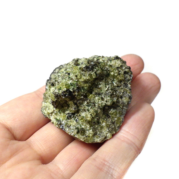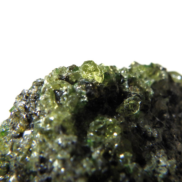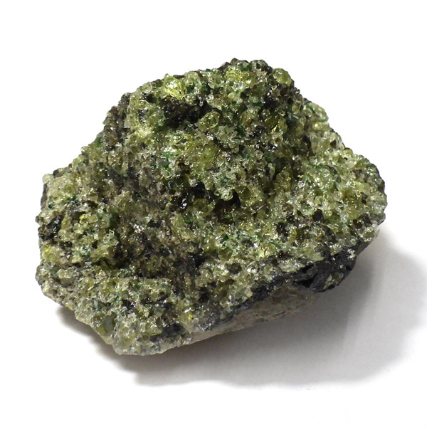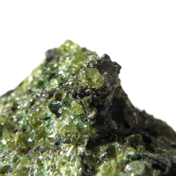アメリカ・アリゾナ州産のペリドット母岩付き原石です。鉱物名をオリビンと呼ぶのですが、日本では宝石名のペリドットが浸透しています。和名は橄欖(かんらん)石といいます。主にグリーンの結晶がかんらん石でチャコールグレーの母岩が玄武岩です。かんらん石は月の岩石や石質隕石、石鉄隕石にも含まれており、鉄の含有量によって、白色から黒色まで色調が変化します。かんらん石は地球の上部マントルの主要構成鉱物でマグマの噴火によって溶岩の塊に運ばれて地表に出てきます。まさにその姿を切り取ったようなこの原石は、様々な濃淡の結晶が多面にわたり観察できます。
