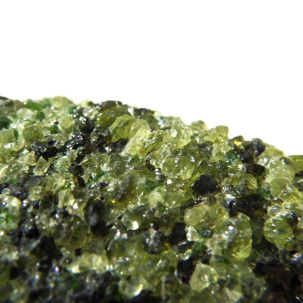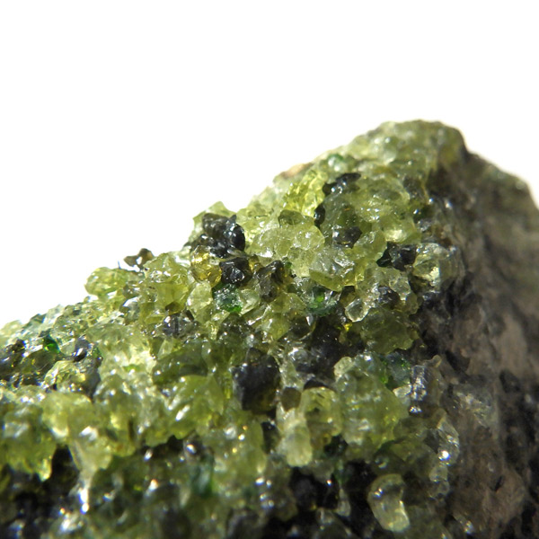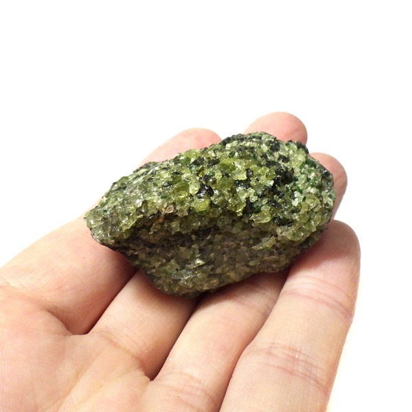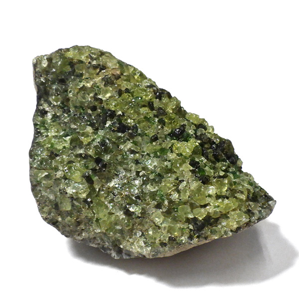 アメリカ・アリゾナ州産のペリドット母岩付き原石です。鉱物名をオリビンと呼ぶのですが、日本では宝石名のペリドットが浸透しています。和名は橄欖(かんらん)石といいます。主にグリーンの結晶がかんらん石でチャコールグレーの母岩が玄武岩です。かんらん石は月の岩石や石質隕石、石鉄隕石にも含まれており、鉄の含有量によって、白色から黒色まで色調が変化します。かんらん石は地球の上部マントルの主要構成鉱物でマグマの噴火によって溶岩の塊に運ばれて地表に出てきます。まさにその姿を切り取ったようなこの原石は、様々な濃淡の結晶が多面にわたり観察できます。