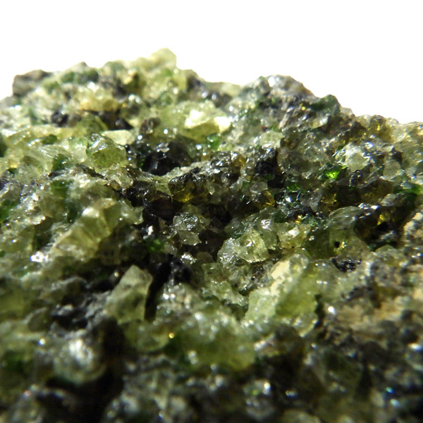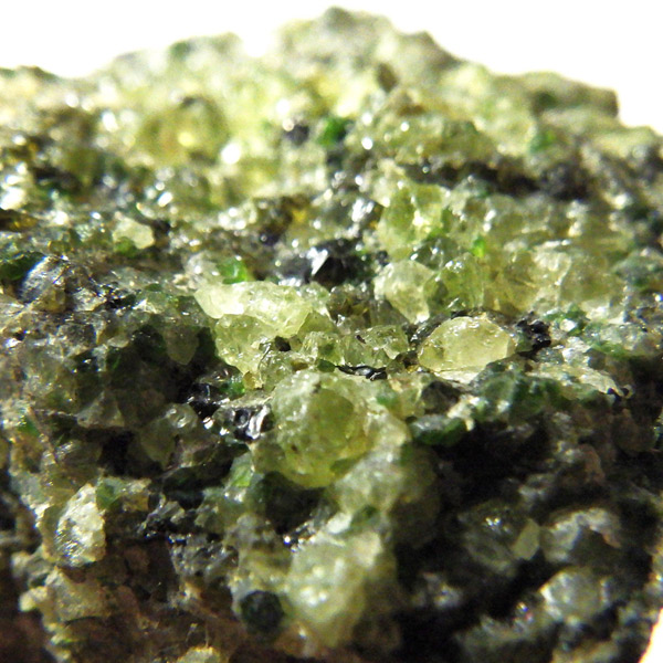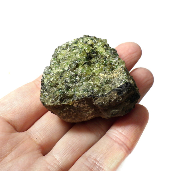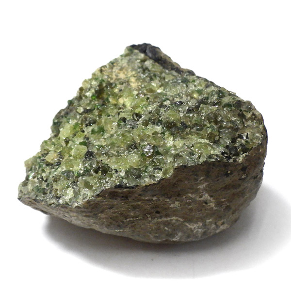 アメリカ・アリゾナ州産のペリドット母岩付き原石です。鉱物名をオリビンと呼ぶのですが、日本では宝石名のペリドットが浸透しています。和名は橄欖(かんらん)石といいます。主にグリーンの結晶がかんらん石でチャコールグレーの母岩が玄武岩です。かんらん石は月の岩石や石質隕石、石鉄隕石にも含まれており、鉄の含有量によって、白色から黒色まで色調が変化します。かんらん石は地球の上部マントルの主要構成鉱物でマグマの噴火によって溶岩の塊に運ばれて地表に出てきます。まさにその姿を切り取ったようなこの原石は、様々な濃淡の結晶が多面にわたり観察できます。