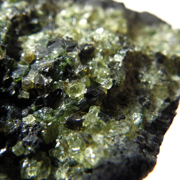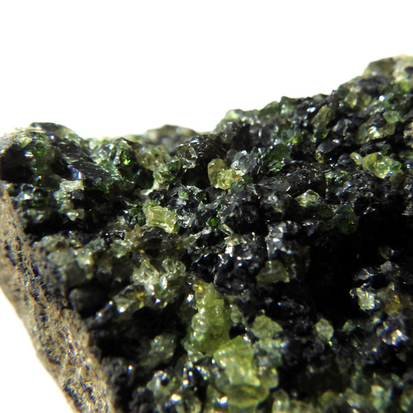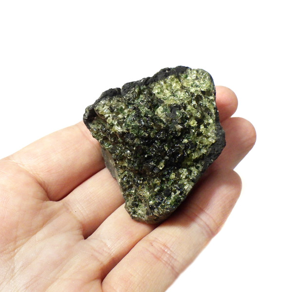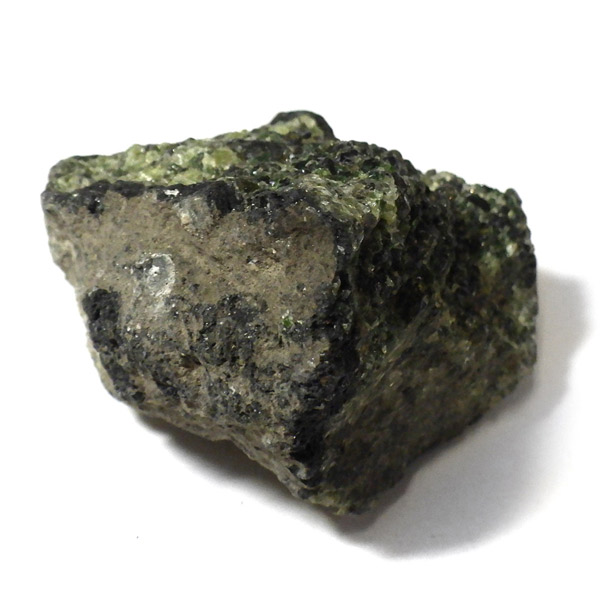 アメリカ・アリゾナ州産のペリドット母岩付き原石です。鉱物名をオリビンと呼ぶのですが、日本では宝石名のペリドットが浸透しています。和名は橄欖(かんらん)石といいます。主にグリーンの結晶がかんらん石でチャコールグレーの母岩が玄武岩です。かんらん石は月の岩石や石質隕石、石鉄隕石にも含まれており、鉄の含有量によって、白色から黒色まで色調が変化します。かんらん石は地球の上部マントルの主要構成鉱物でマグマの噴火によって溶岩の塊に運ばれて地表に出てきます。まさにその姿を切り取ったようなこの原石は、様々な濃淡の結晶が多面にわたり観察できます。