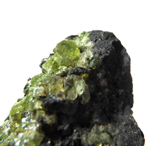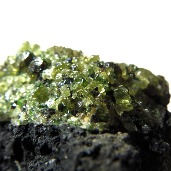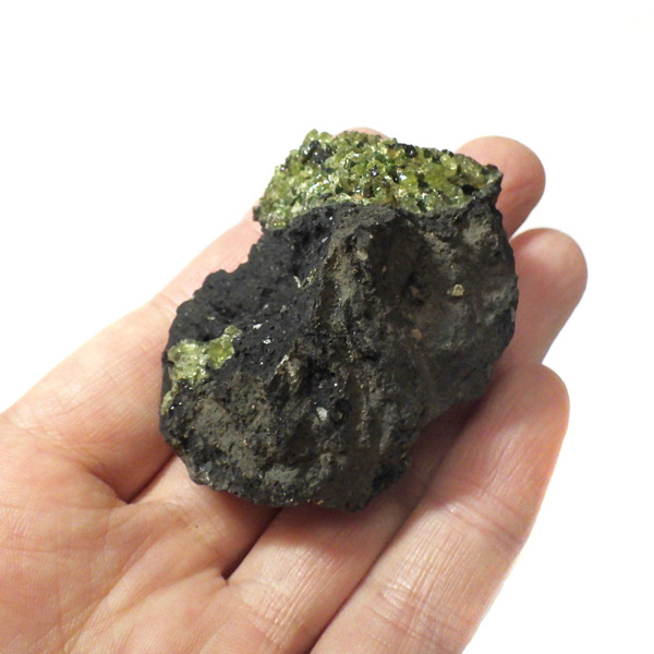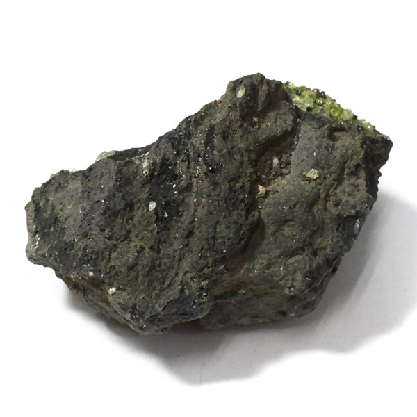 アメリカ・アリゾナ州産のペリドット母岩付き原石です。鉱物名をオリビンと呼ぶのですが、日本では宝石名のペリドットが浸透しています。和名は橄欖(かんらん)石といいます。主にグリーンの結晶がかんらん石でチャコールグレーの母岩が玄武岩です。かんらん石は月の岩石や石質隕石、石鉄隕石にも含まれており、鉄の含有量によって、白色から黒色まで色調が変化します。かんらん石は地球の上部マントルの主要構成鉱物でマグマの噴火によって溶岩の塊に運ばれて地表に出てきます。まさにその姿を切り取ったようなこの原石は、様々な濃淡の結晶が多面にわたり観察できます。