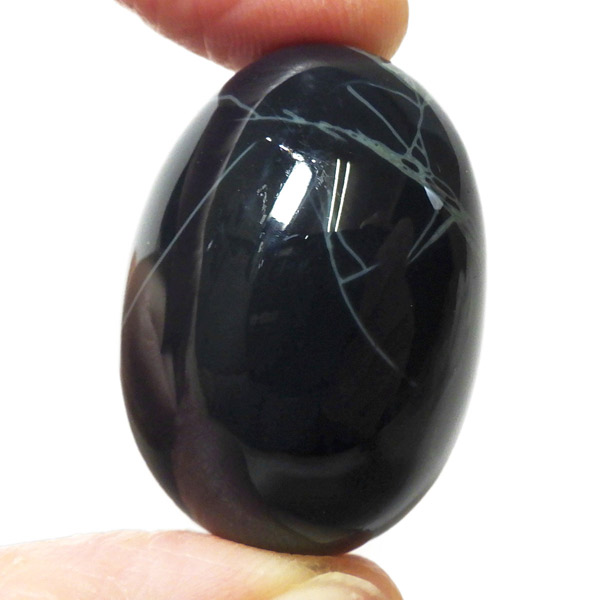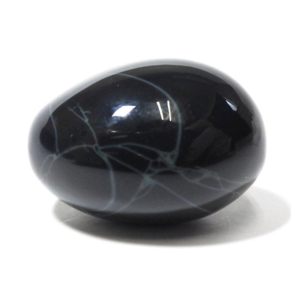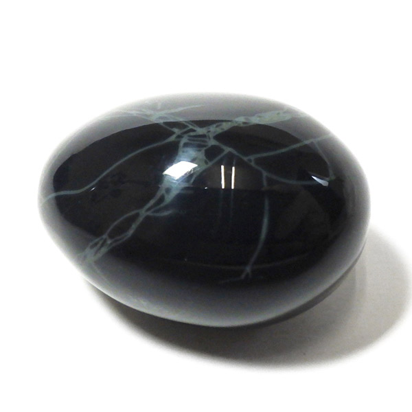 メキシコ産のオブシディアン、タンブルです。スパイダーウェブオブシディアンは、その名の通り、蜘蛛の巣のような模様を持つ黒曜石の一種です。黒い地に灰色の細い線が網目状に走るのが最大の特徴。この網目模様が、蜘蛛の巣のように見えるためスパイダーウェブと特別に呼ばれています。オブシディアンは火山の噴火によって生じる天然のガラスで、急速に冷却された溶岩が結晶化せずに固まったものです。スパイダーウェブオブシディアンは内部の微細な割れ目や亀裂に鉱物成分が充填されたものと考えられています。通常のオブシディアンよりは珍しいもので、模様の出方は個体差が大きく、模様の出方が良いものを厳選して仕入れています。とても格好良い石で、持ちやすく手触りも滑らかで、お守りとして持ち歩くのにもぴったりです。