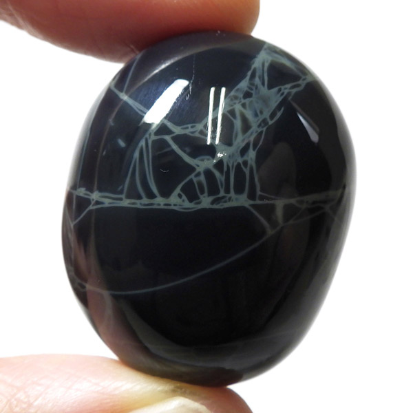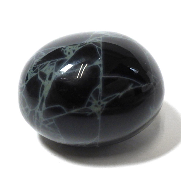 メキシコ産のオブシディアン、タンブルです。スパイダーウェブオブシディアンは、その名の通り、蜘蛛の巣のような模様を持つ黒曜石の一種です。黒い地に灰色の細い線が網目状に走るのが最大の特徴。この網目模様が、蜘蛛の巣のように見えるためスパイダーウェブと特別に呼ばれています。オブシディアンは火山の噴火によって生じる天然のガラスで、急速に冷却された溶岩が結晶化せずに固まったものです。スパイダーウェブオブシディアンは内部の微細な割れ目や亀裂に鉱物成分が充填されたものと考えられています。通常のオブシディアンよりは珍しいもので、模様の出方は個体差が大きく、模様の出方が良いものを厳選して仕入れています。とても格好良い石で、持ちやすく手触りも滑らかで、お守りとして持ち歩くのにもぴったりです。