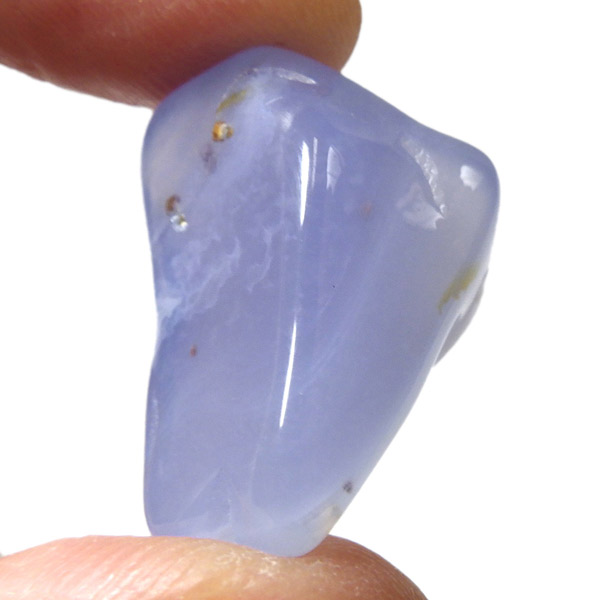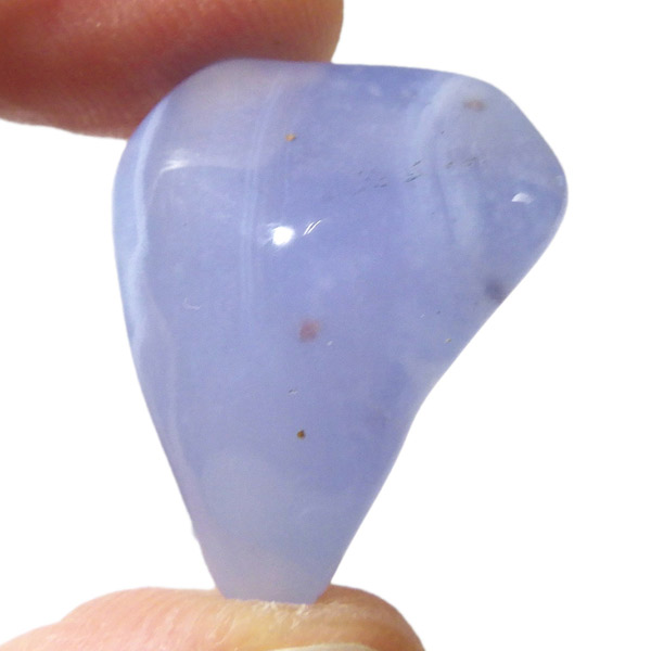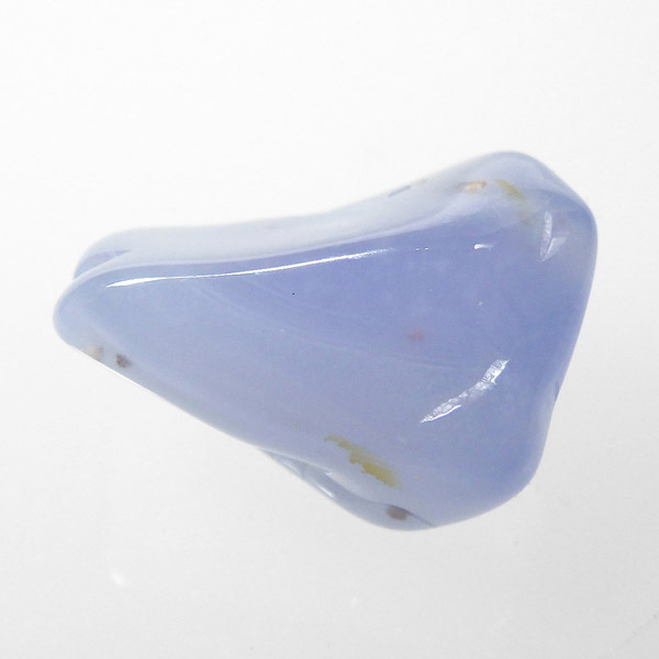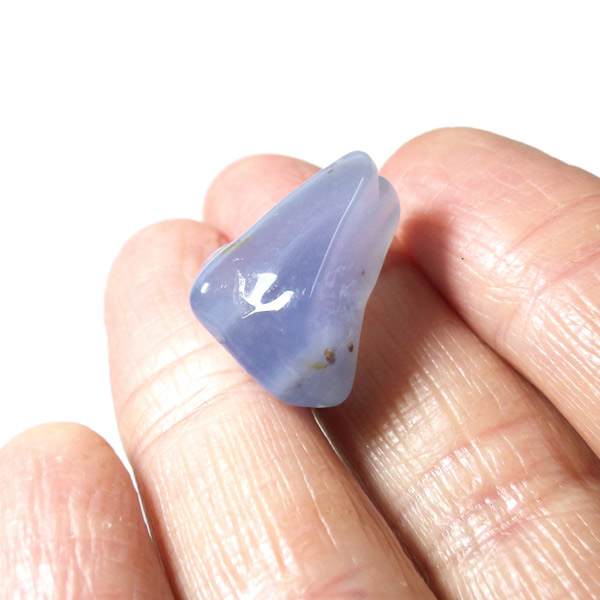 トルコ産のブルーカルセドニー、タンブルです。カルセドニーはアゲートとよく似ており、いろいろな色が混ざっており、模様があるものがアゲート、色が均一で模様がないものがカルセドニー分類されています。カルセドニーのグループにはカーネリアンやクリソプレーズなど鮮やかな石があるのは有名です。こちらのブルーカルセドニーは落ち着いたブルーの天然の発色で、光に透かした透過光は赤みを帯びたミルキーな色味があります。カルセドニーの産地でも白っぽいライトなブルーカルセドニーなども多く、ブルーカルセドニーの中でも発色が良く、高品質なタンブルです。