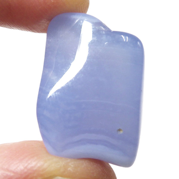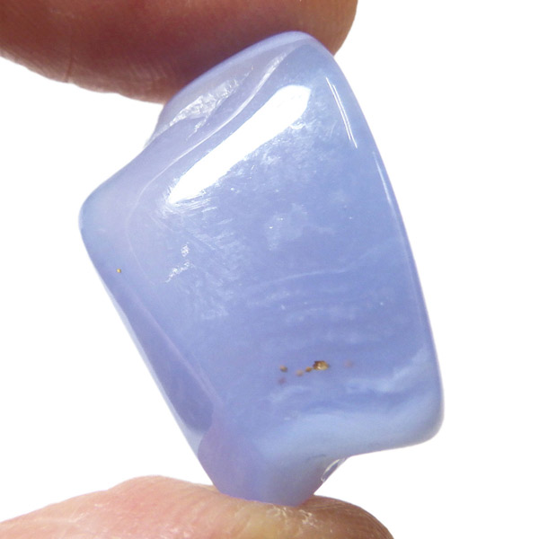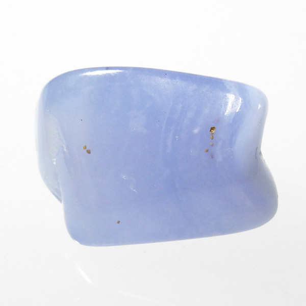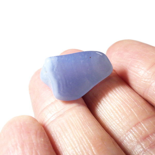 トルコ産のブルーカルセドニー、タンブルです。カルセドニーはアゲートとよく似ており、いろいろな色が混ざっており、模様があるものがアゲート、色が均一で模様がないものがカルセドニー分類されています。カルセドニーのグループにはカーネリアンやクリソプレーズなど鮮やかな石があるのは有名です。こちらのブルーカルセドニーは落ち着いたブルーの天然の発色で、光に透かした透過光は赤みを帯びたミルキーな色味があります。カルセドニーの産地でも白っぽいライトなブルーカルセドニーなども多く、ブルーカルセドニーの中でも発色が良く、高品質なタンブルです。