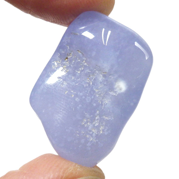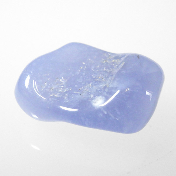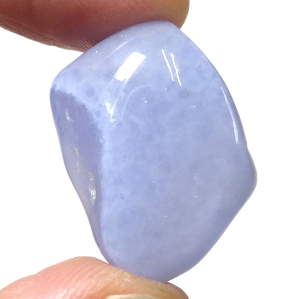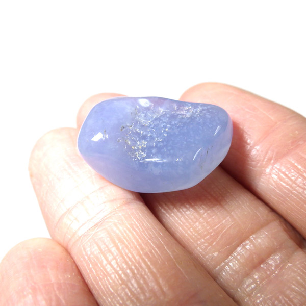 トルコ産のブルーカルセドニー、タンブルです。カルセドニーはアゲートとよく似ており、いろいろな色が混ざっており、模様があるものがアゲート、色が均一で模様がないものがカルセドニー分類されています。カルセドニーのグループにはカーネリアンやクリソプレーズなど鮮やかな石があるのは有名です。こちらのブルーカルセドニーは落ち着いたブルーの天然の発色で、光に透かした透過光は赤みを帯びたミルキーな色味があります。カルセドニーの産地でも白っぽいライトなブルーカルセドニーなども多く、ブルーカルセドニーの中でも発色が良く、高品質なタンブルです。