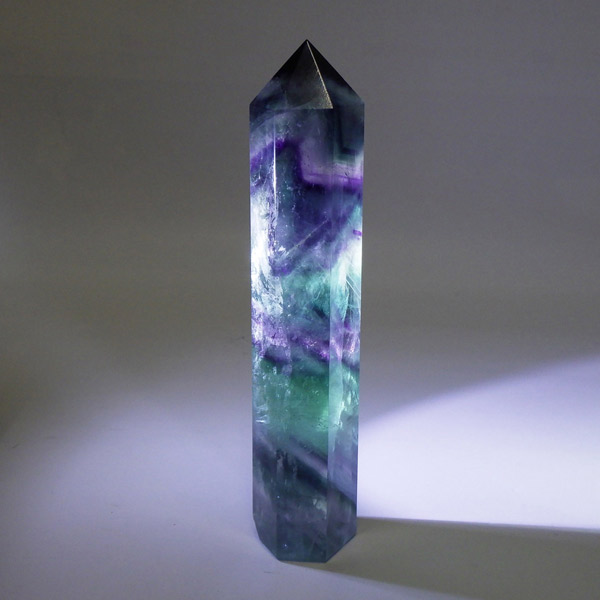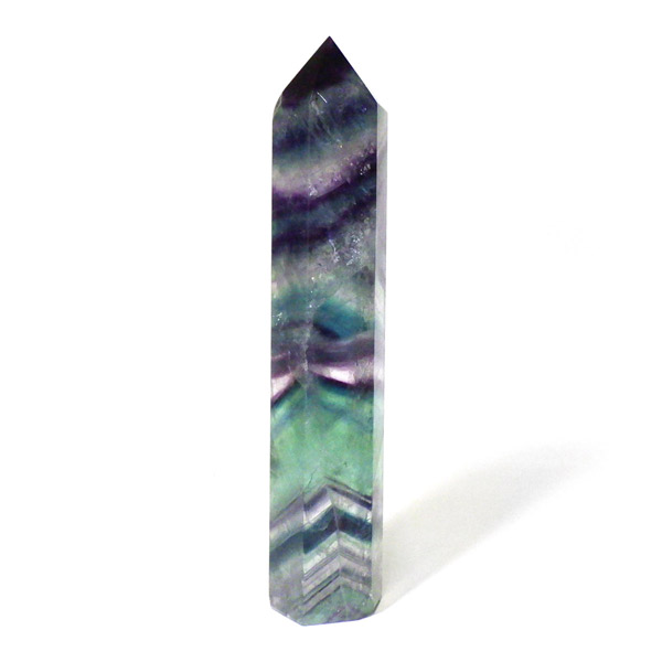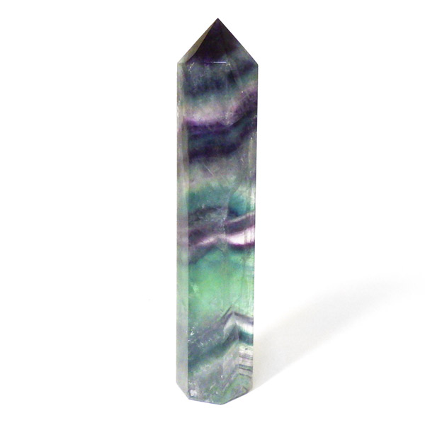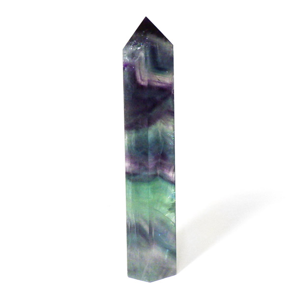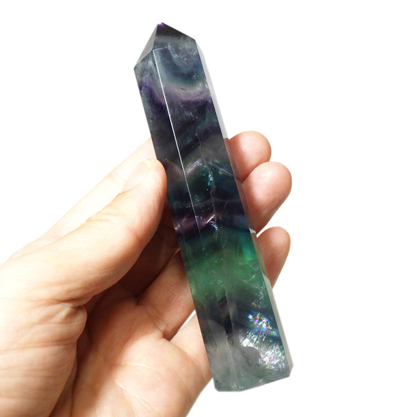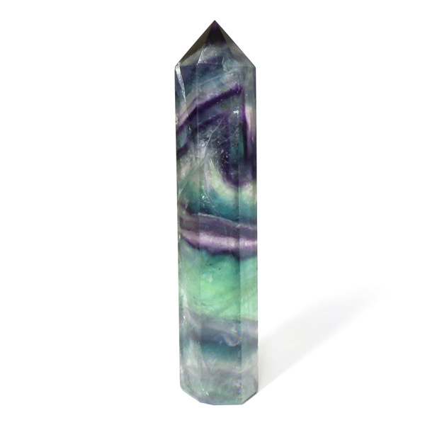 チャイナ産高品質マルチカラーフローライトのポリッシュポイントです。 紫、緑、青を中心に美しいグラデーションが層状に重なり、芸術作品のような一本です。 透明感のある部分は光を通し、見る角度によって色彩の表情が変化するのも魅力的。 フローライトは「集中力や直感力を高める石」として知られ、心の整理や思考のクリアリングをサポートすると言われています。 デスクやお気に入りの空間に置けば、視覚的な癒しとともに、心を整える静かな時間をもたらしてくれるかと思います。