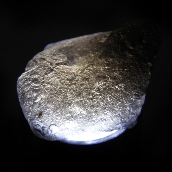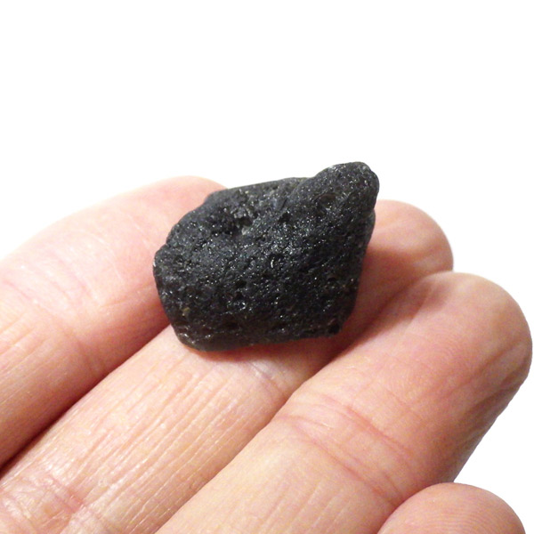 インドネシア・ジャワ島で採掘される希少な天然ガラスであるアグニマニタイトの原石です。アグニマニタイトの石の名前は、サンスクリット語で「火の神」を意味するアグニと「宝石」を意味するマニに由来し、「火の宝石」として知られています。表面はマットな黒~グレーの質感で、ごつごつとした天然のテクスチャが魅力的。光に透かすと、ほんのりスモーキーで神秘的な雰囲気を放ちます。フォルムや質感が面白い原石です。鉱物コレクションやお守り、アクセサリー制作にもおすすめです。