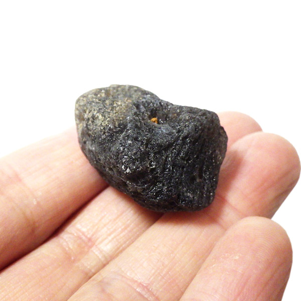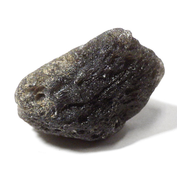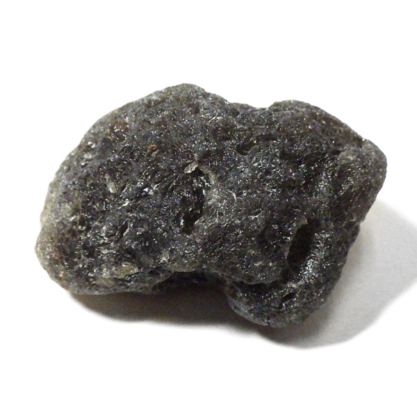 インドネシア・ジャワ島で採掘される希少な天然ガラスであるアグニマニタイトの原石です。アグニマニタイトの石の名前は、サンスクリット語で「火の神」を意味するアグニと「宝石」を意味するマニに由来し、「火の宝石」として知られています。表面はマットな黒~グレーの質感で、ごつごつとした天然のテクスチャが魅力的。光に透かすと、ほんのりスモーキーで神秘的な雰囲気を放ちます。フォルムや質感が面白い原石です。鉱物コレクションやお守り、アクセサリー制作にもおすすめです。