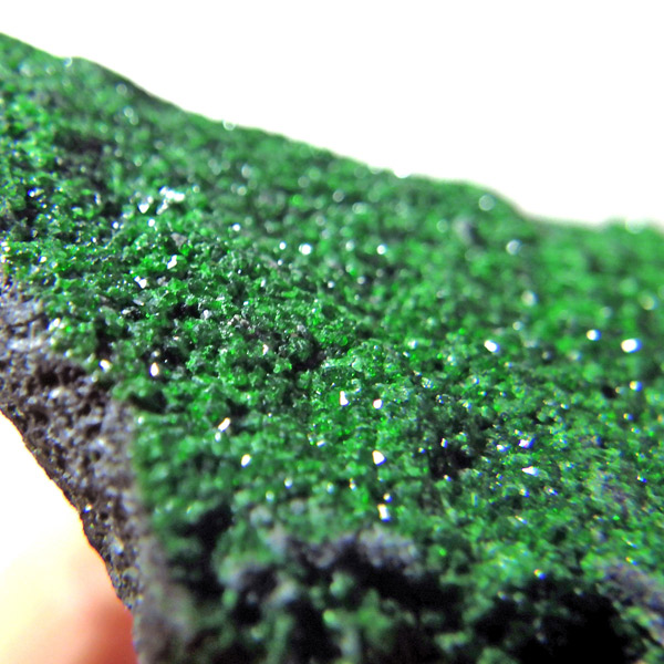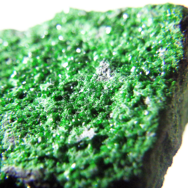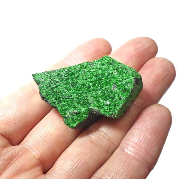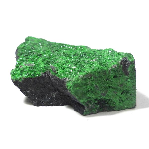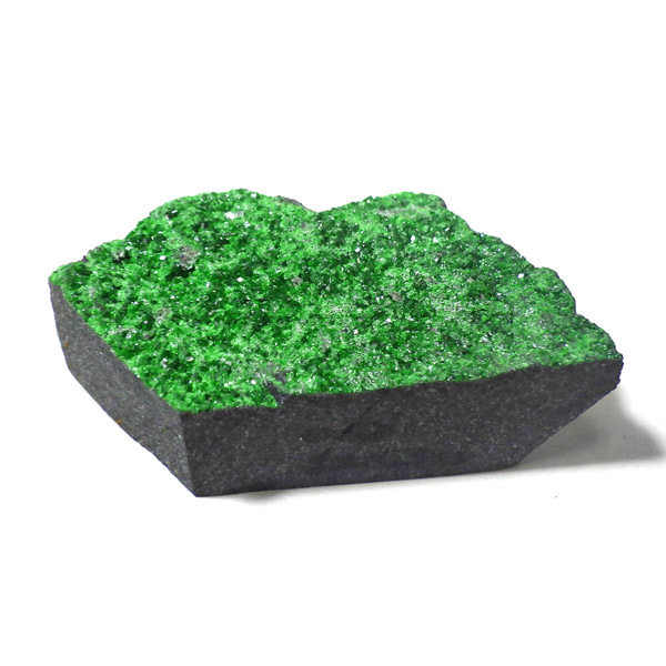 深いエメラルドグリーンが美しい、希少なウバロバイトガーネットの原石です。 ウバロバイトはガーネットグループの中でも特に産出量が少なく、コレクターから高い人気を誇ります。結晶は細やかで、まるで宝石のような輝きを放ちます。 ロシア・ウラル山脈産のものは特に鮮やかな緑色で知られ、母岩を覆うようにきらめく結晶群が魅力的です。