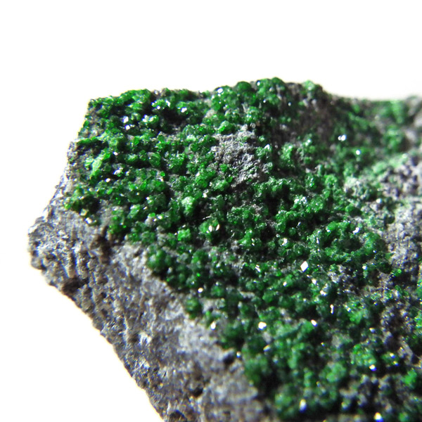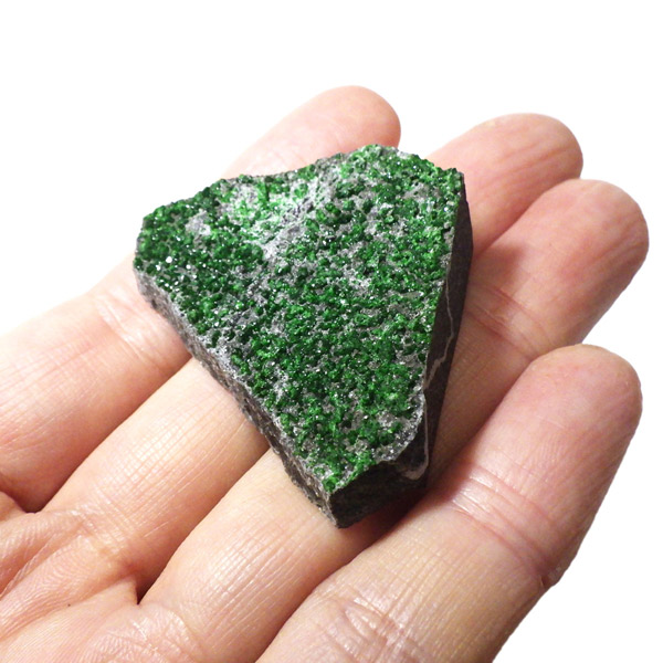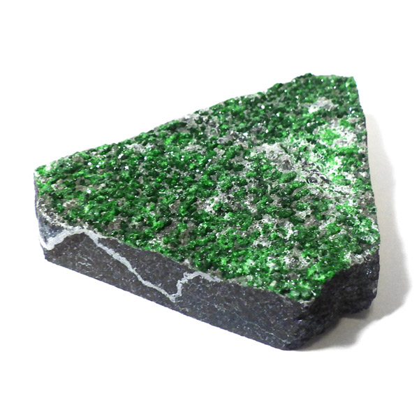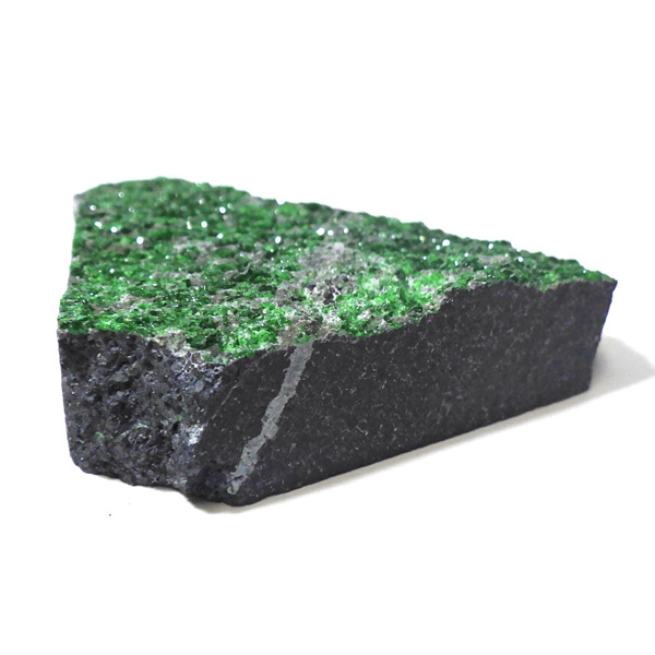 深いエメラルドグリーンが美しい、希少なウバロバイトガーネットの原石です。 ウバロバイトはガーネットグループの中でも特に産出量が少なく、コレクターから高い人気を誇ります。結晶は細やかで、まるで宝石のような輝きを放ちます。 ロシア・ウラル山脈産のものは特に鮮やかな緑色で知られ、母岩を覆うようにきらめく結晶群が魅力的です。