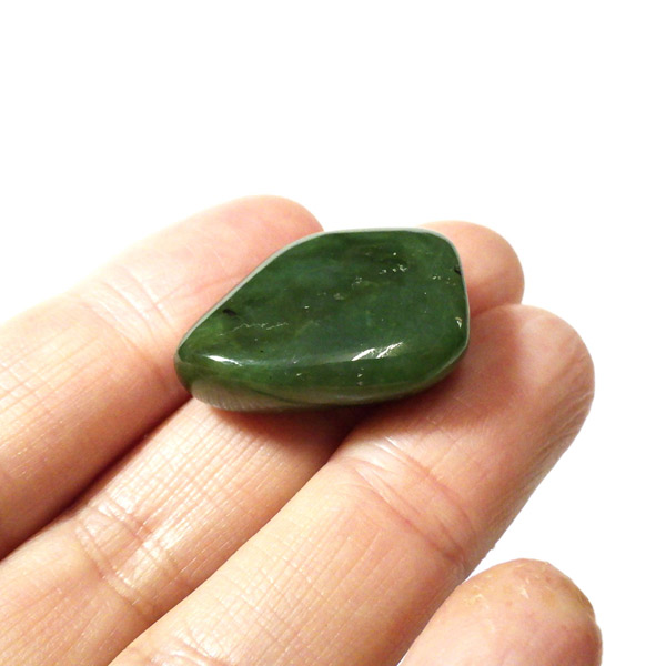 カナダ産のカナディアンジェイド、タンブルです。 カナダで産出するジェイド(翡翠)でとても深いグリーンが美しいです。ジェイド又はジェードと表記されます。翡翠には二種類あり、カナディアンジェイドはネフライトになります。翡翠は1863年までは単一の種類の宝石と考えられてきましたが、ジェダイトとネフライトの2種類に分類された歴史があります。