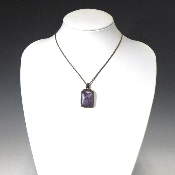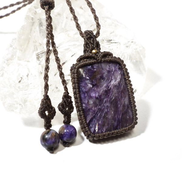 神秘的な紫の模様が美しい、ロシア産のチャロアイトを使ったマクラメペンダントです。 チャロアイトの幻想的な色合いと独特の模様が魅力的。チャロアイトは癒しの石として知られ、心を落ち着かせ、前向きなエネルギーをもたらしてくれるといわれています。全体的に大人びたシックな仕上がりとなっております。