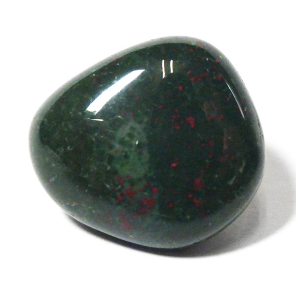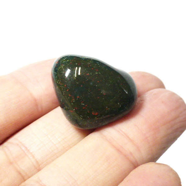 インド産のブラッドストーン、タンブルです。ブラッドストーンはジャスパーの一種で濃緑色の地に赤い斑点や模様の入った石です。鉄に起因する赤い斑点が見られる石で、赤斑点が血の様に見られることからブラッドストーンと呼ばれています。