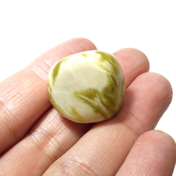 スコットランド産、アイオナマーブルのタンブルです。アイオナマーブルは、スコットランドのアイオナ島で産出する大理石です。蛇紋岩と石灰岩の独特な組み合わせで構成されています。現在は採石されておらず、大規模な流通はしておりません。アイオナ島の漁師たちは、聖なる石として石を持たずに港を出ることはなかったといわれています。イエローグリーンとホワイトの組み合わせが可愛らしく、柔らかな色味でとても癒されます。