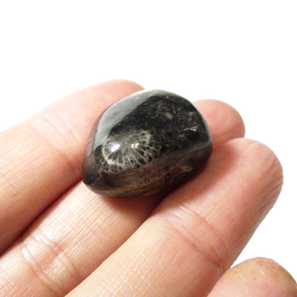 内部には海百合やサンゴなど約3.25億年前の化石が含まれ、白い模様として浮かび上がるのが特徴です。