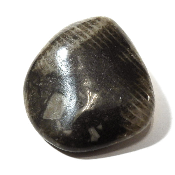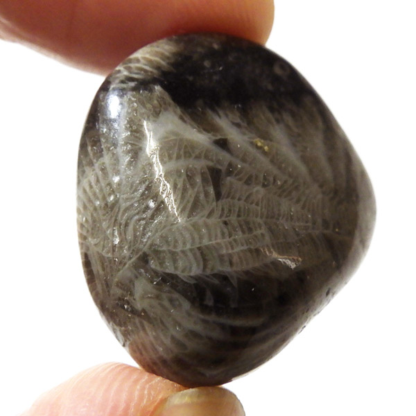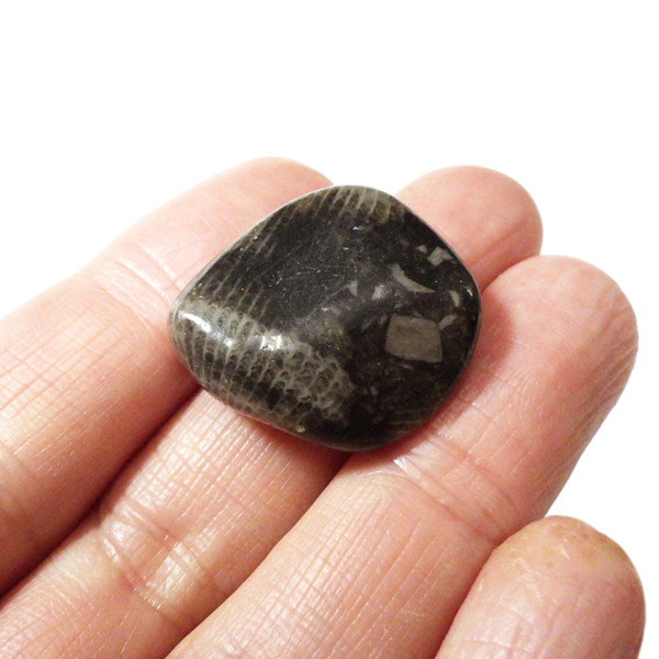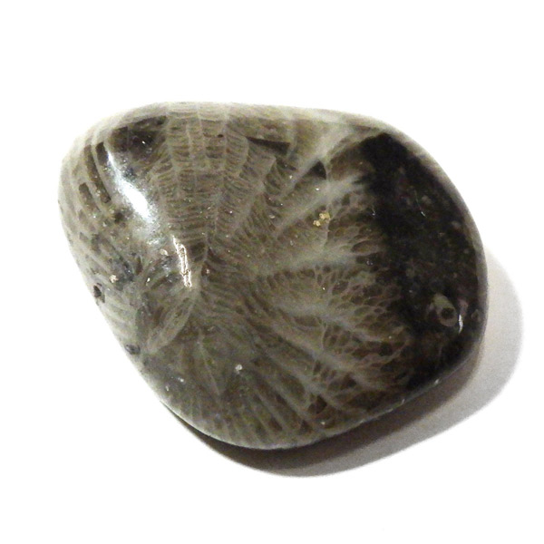 イングランド・ダラム州のフロスターリーでかつて産出したフロスターリーマーブルのタンブルです。 正確にはマーブル(大理石)ではなく、化石を含む石灰岩ですが、磨くと美しい光沢を放つことからマーブルと呼ばれています。 内部には海百合やサンゴなど約3.25億年前の化石が含まれ、白い模様として浮かび上がるのが特徴です。 その名は産地である村フロスターリーに由来しています。別名としてバチカンストーンとも呼ばれております。