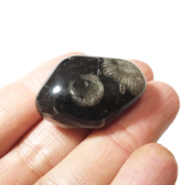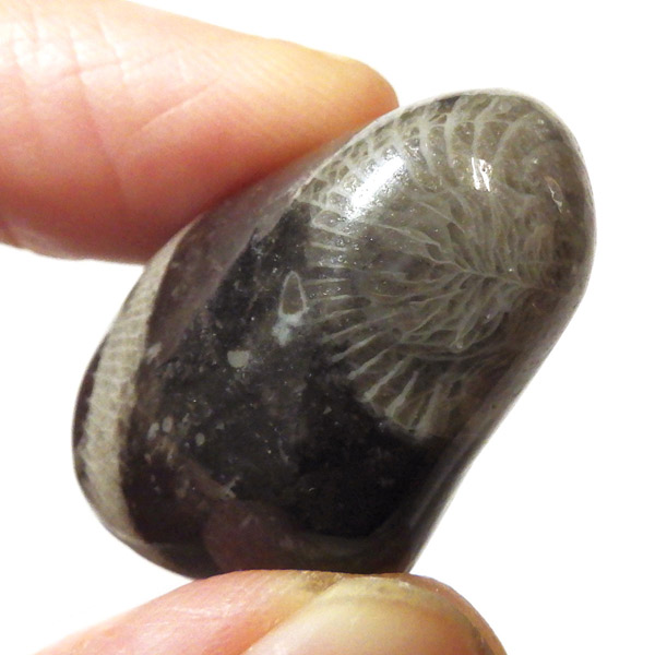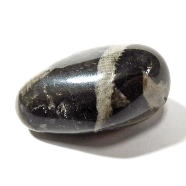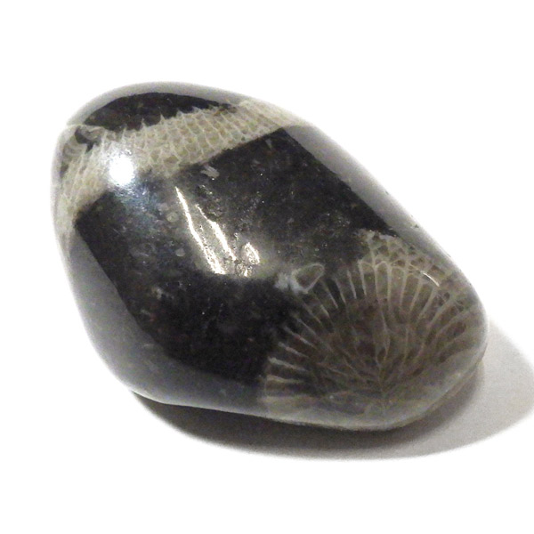 イングランド・ダラム州のフロスターリーでかつて産出したフロスターリーマーブルのタンブルです。 正確にはマーブル(大理石)ではなく、化石を含む石灰岩ですが、磨くと美しい光沢を放つことからマーブルと呼ばれています。 内部には海百合やサンゴなど約3.25億年前の化石が含まれ、白い模様として浮かび上がるのが特徴です。 その名は産地である村フロスターリーに由来しています。別名としてバチカンストーンとも呼ばれております。