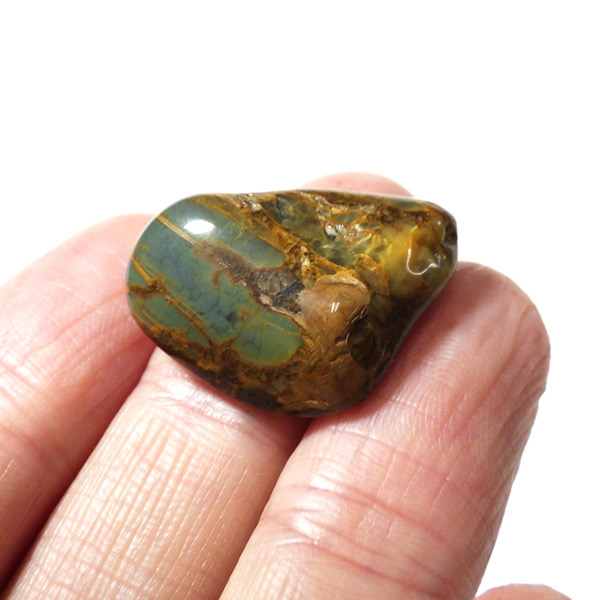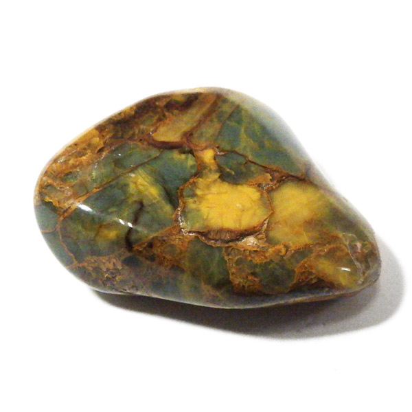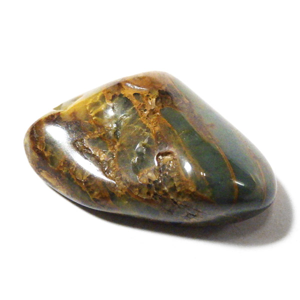 ナミビア産のネライト、タンブルです。ネライトはタイガーアイとピーターサイトの中間的な性質を持つ石に付けられた流通名です。タイガーアイの成分を持つ鉱物が、地殻変動によって粉砕され、膨大な年月を掛けて石英により自然に接合されて出来た鉱物です。そのため、タイガーアイのように繊維が直線状に形成されず、ピーターサイトに近い渦を巻くような流動的模様になります。鉱物学的正式名称はクロシドライトアゲートとなるかと思います。