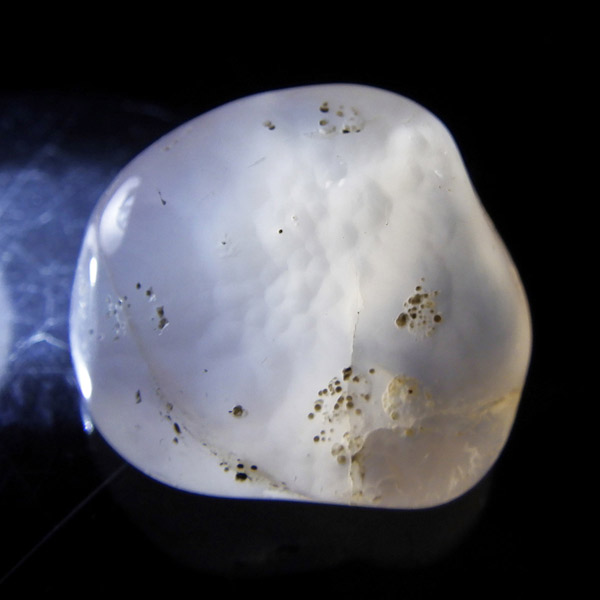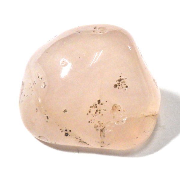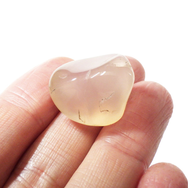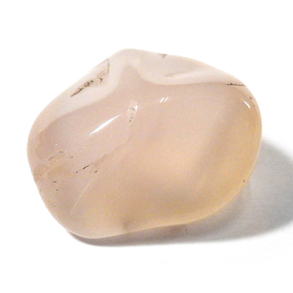 ナミビア産のピンクカルセドニー、タンブルです。 カルセドニーはカーネリアンやクリソプレーズ、アゲートなどと同じ珪酸塩鉱物で、石英の微細結晶が集まってできています。透明に結晶化したものが水晶ですが、こちらはカルセドニー特有の半透明感が魅力的。 優しいピンク色に色づいた石は、光に透かすとローズクォーツとはまた異なる雰囲気を見せ、ぬめっとした柔らかな質感が感じられます。可愛らしくも上品な印象を持つ、美しい天然石です。
