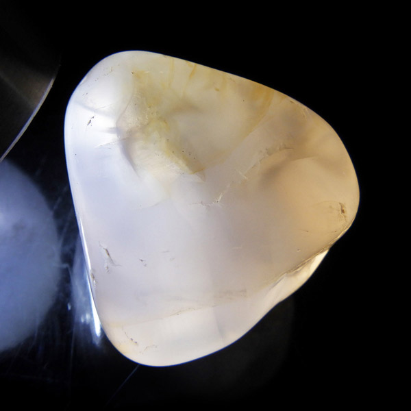 カルセドニーはカーネリアンやクリソプレーズ、アゲートなどと同じ珪酸塩鉱物で、石英の微細結晶が集まってできています。透明に結晶化したものが水晶ですが、こちらはカルセドニー特有の半透明感が魅力的。