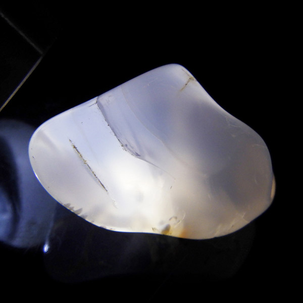 カルセドニーはカーネリアンやクリソプレーズ、アゲートなどと同じ珪酸塩鉱物で、石英の微細結晶が集まってできています。透明に結晶化したものが水晶ですが、こちらはカルセドニー特有の半透明感が魅力的。