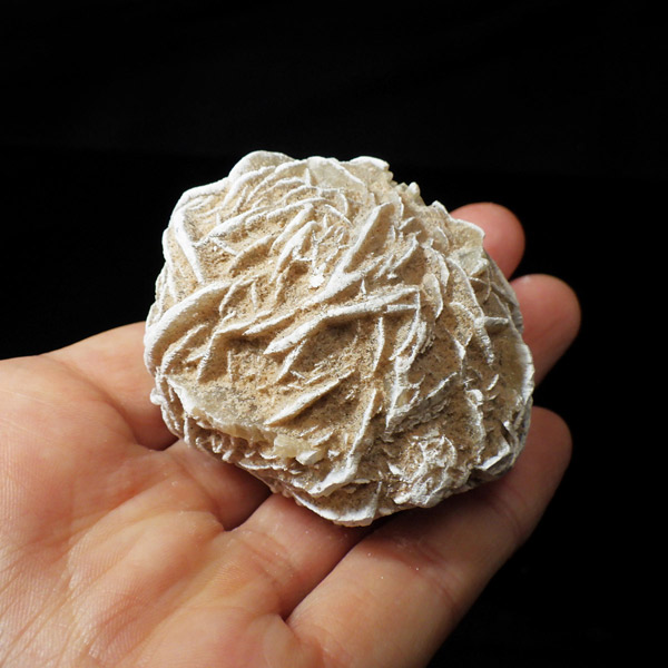 メキシコ産、デザートローズの原石です。手のひらに収まる大きさで形がかわいい結晶を厳選して集めました。デザートローズはジプサムを主成分とした砂漠で見つかる薔薇の花の形の結晶のことです。全体のフォルムとして見た目が丸っこく、細かいところまで織り成す結晶の美しさと神秘さが素敵です。