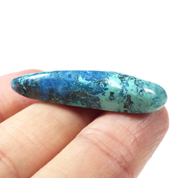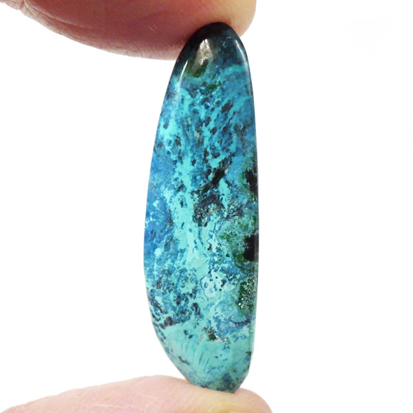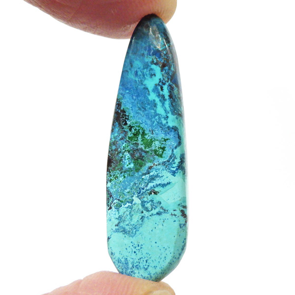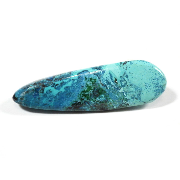 深みのあるブルーから鮮やかなブルーグリーンまでの色彩を持ちます。主に銅鉱床の酸化帯に産出し、クリソコラ、マラカイト、アズライト、キュープライトなどと共生することが多い鉱物です。