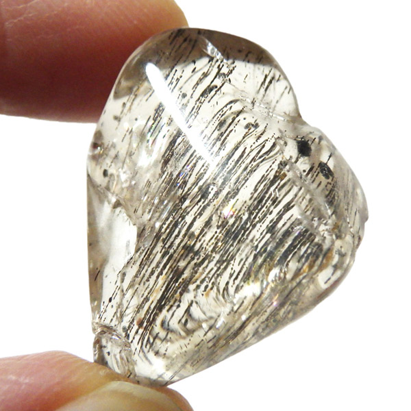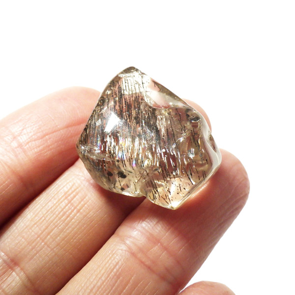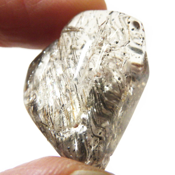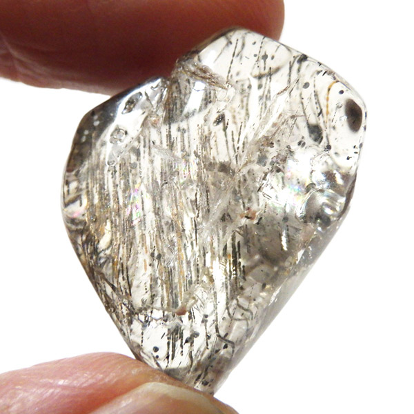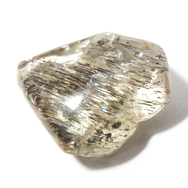 色合いは無色・白・黄色・ピンク・紫・青・褐色・灰色など多彩で、こちらの個体は内部に繊細な結晶の筋が見られます。