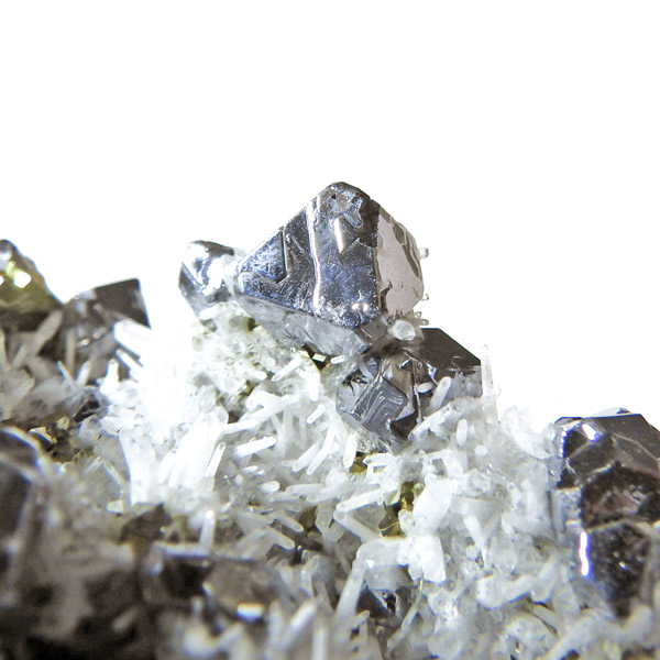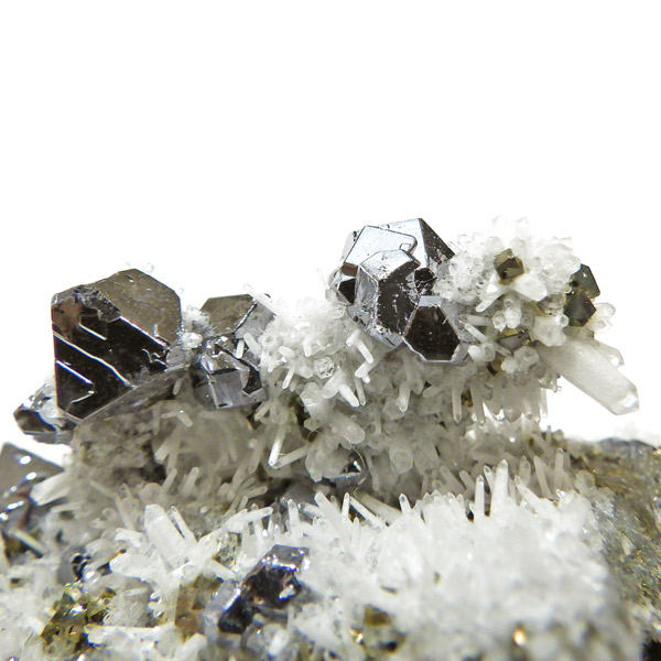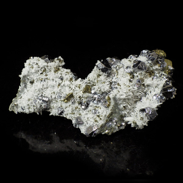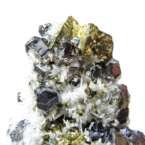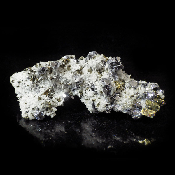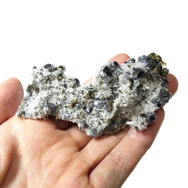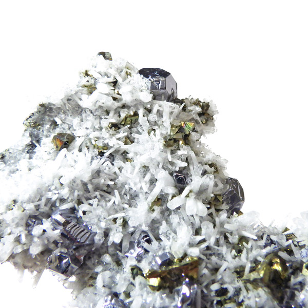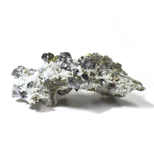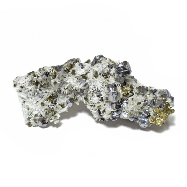 ガレーナ(方鉛鉱)にパイライト(黄鉄鉱)とクォーツ(水晶)が共生した原石です。 金属光沢のあるガレーナの結晶に、黄金色のパイライトがアクセントを添え、 そこに透明感のあるクォーツが加わることで、非常に美しいコントラストを生み出しています。 重厚感と輝きを併せ持つ、存在感のある標本です。