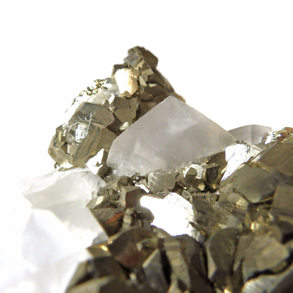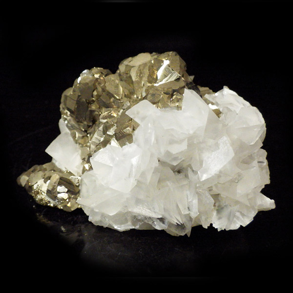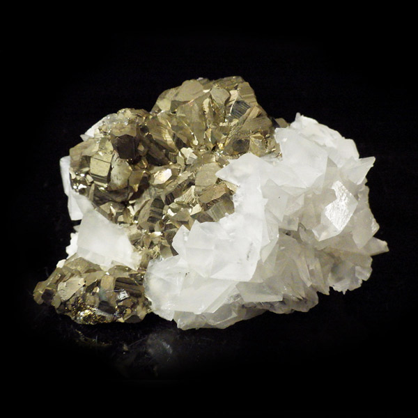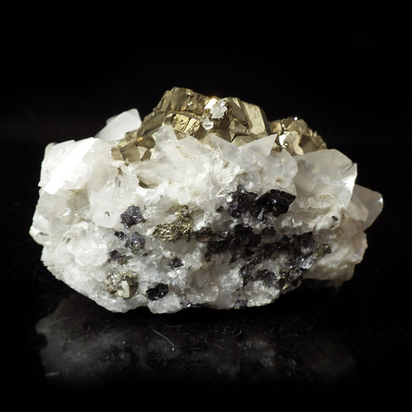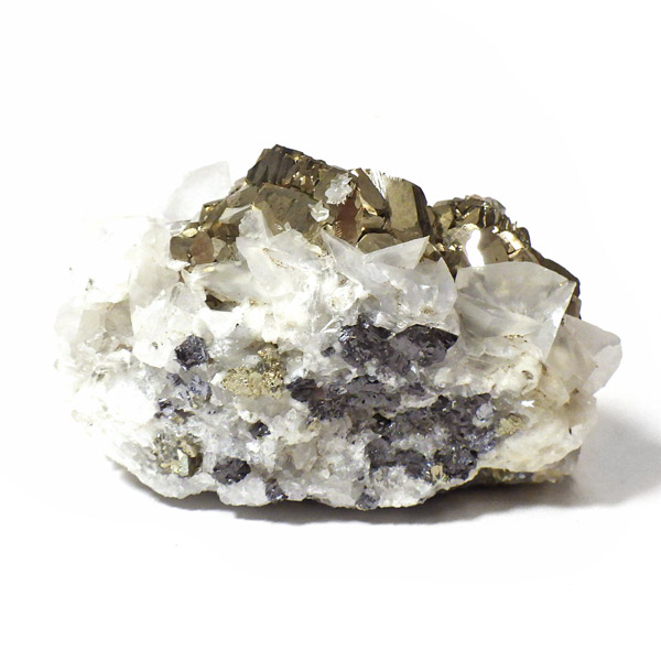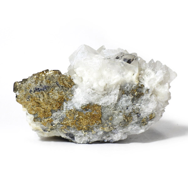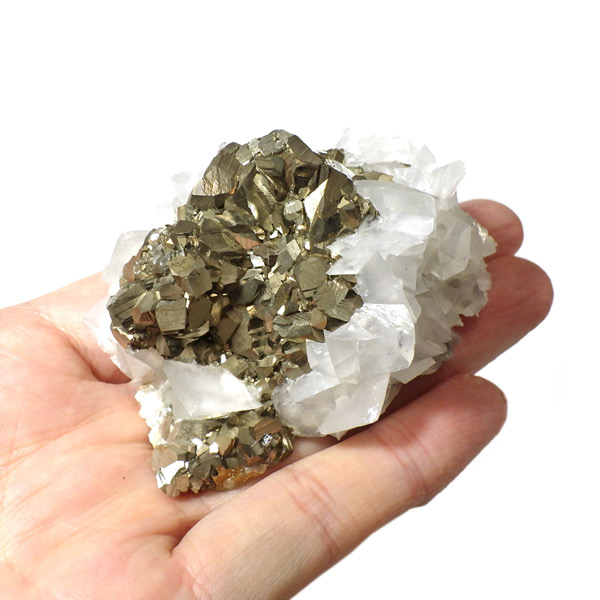 はっきりとした結晶を持つパイライト(黄鉄鉱)とカルサイト(方解石)が共生した原石です。 パイライトの金属光沢のある表面が美しく輝き、結晶の形が明瞭で、左右で異なる表情を見せる姿はまさにアートのようです。 パイライトの黄金色とカルサイトの柔らかな白色が調和し、重厚感の中にも上品さを感じさせる標本です。