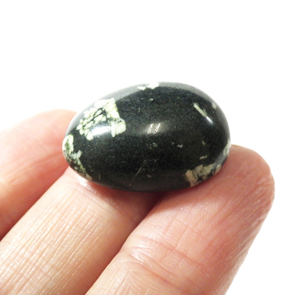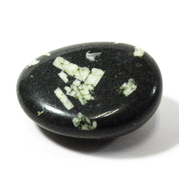 アメリカ・カリフォルニア州産のチャイニーズライティングストーンのタンブルです。 黒い玄武岩の母岩の中に白い長石が散らばり、その模様がまるで漢字のように見えることから、アメリカ人によって「Chinese Writing Stone(漢字石)」と名付けられました。 漢字石は、黒色の玄武岩質の母岩と白色の斜長石結晶からなる火成岩の一種です。 自然が描いた文字のような模様はひとつとして同じものがなく、独特の趣を感じさせてくれます。