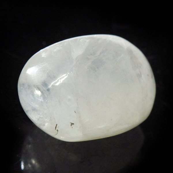 インド産のブルームーンストーン、タンブルです。ムーンストーンは長石(フェルドスパー)グループに属する鉱物で、和名を「月長石」といいます。 石の内部にある微細な層が光を乱反射することで現れる、真珠のように柔らかな光の効果を「シラー効果」と呼びます。ムーンストーン特有のこの輝きは、青白い光だけでなく、ピンク、オレンジ、白、グレーなどさまざまな色合いで見られます。