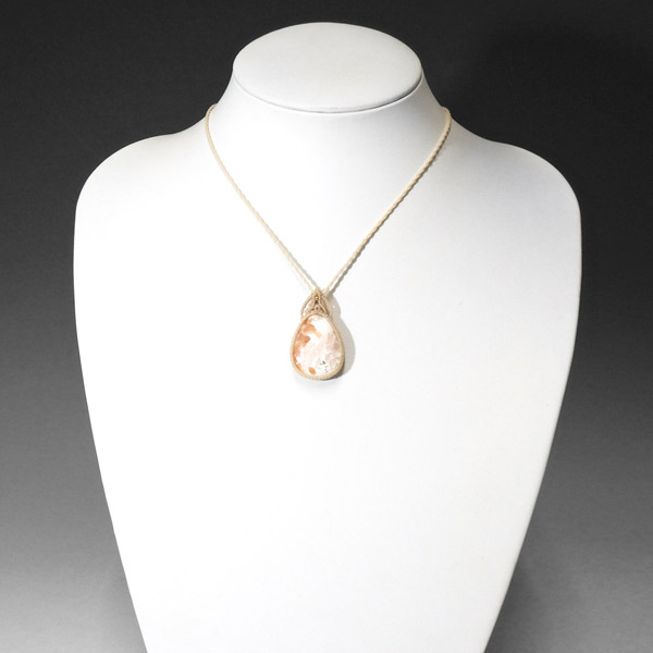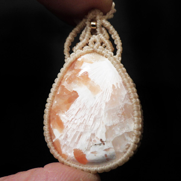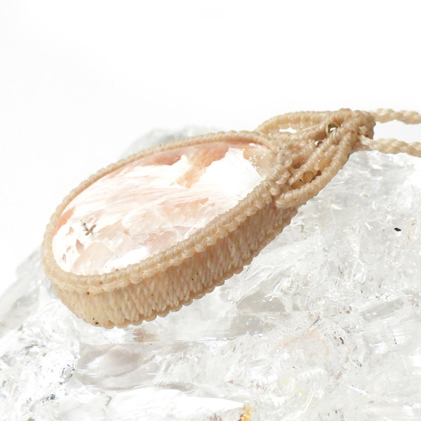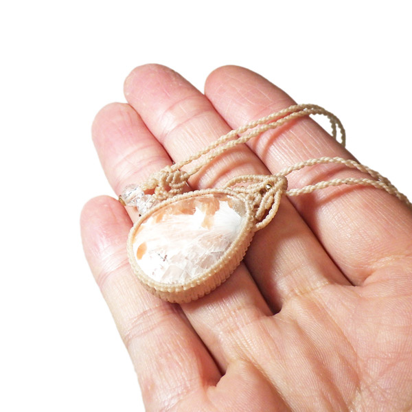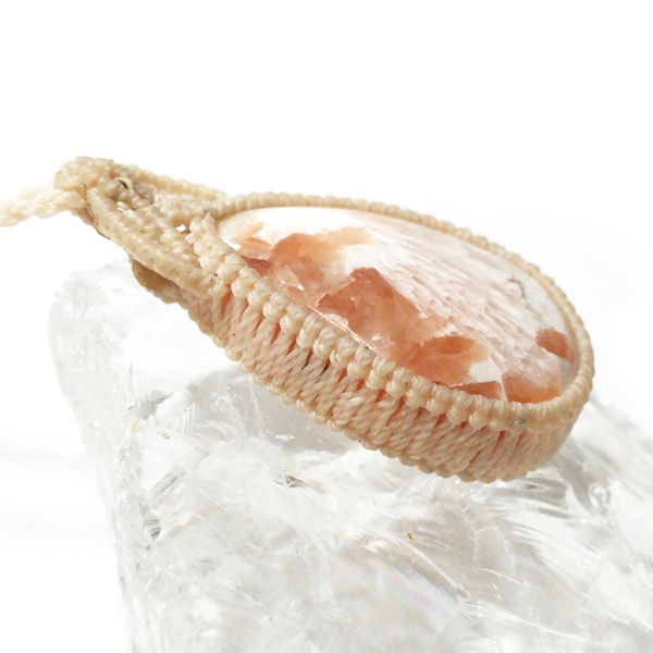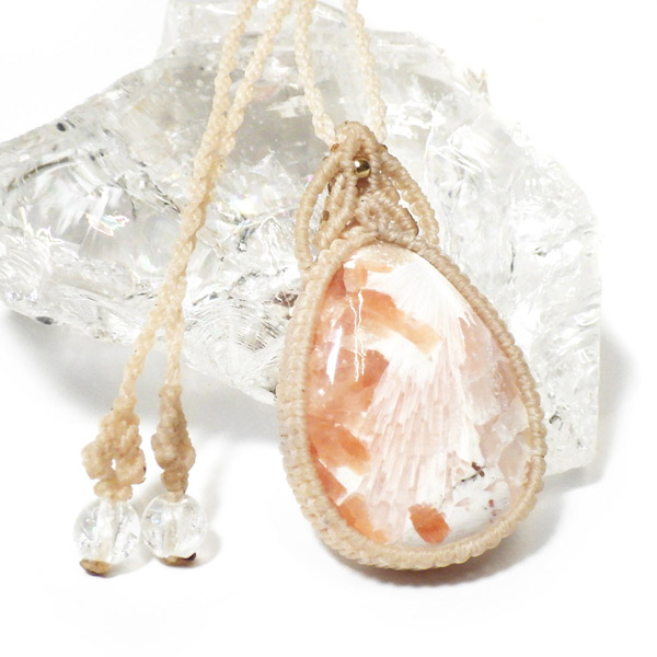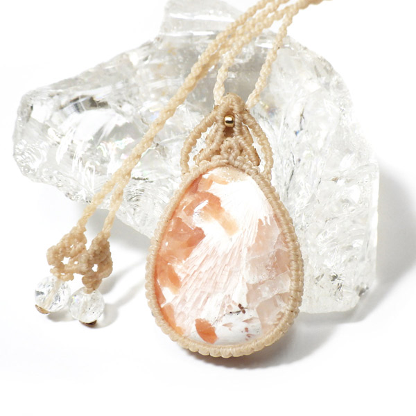 オレンジの束状がスティルバイト、白く細長い繊維状の結晶がスコレサイトです。スコレサイトは純粋さや調和を象徴し、心を穏やかに整えてくれる石。深い癒しをもたらすといわれています。スティルバイトは優しさと安らぎの波動を持ち、感情のバランスを整えるサポートをしてくれる石。直感力や創造力を高めるともいわれています。この2つの鉱物が織りなす神秘的なハーモニーにより、穏やかで落ち着きを与えてくれるペンダントとなっています。
