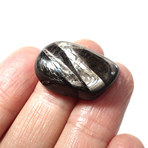 カナダ産のハイパーシーン、タンブルです。和名は紫蘇輝石。ハイパーシーンは、シックでメタリックな光沢と落ち着いた黒褐色が特徴の美しい天然石です。光の角度によって美しい輝きを放つシラー効果が魅力的な一品です。厳選された高品質な個体で、上品な光の表情をお楽しみいただけます。