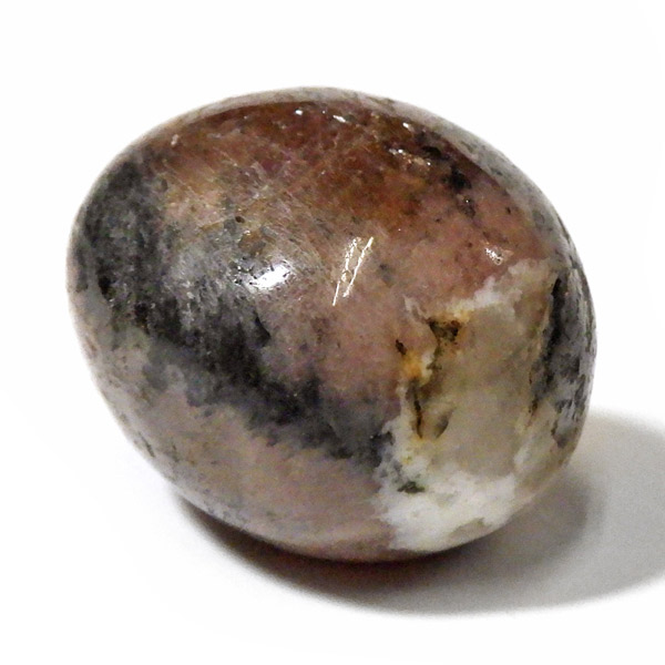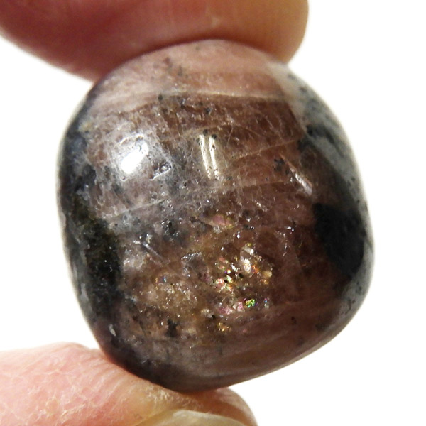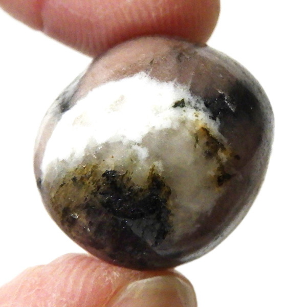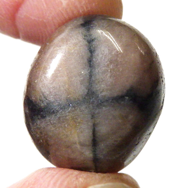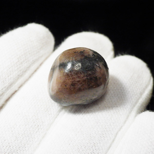スペイン産、キャストライトタンブルです。濃いブラウンに黒の十字模様が大変魅力的な石です。 キャストライトの名前は、輪切りにすると黒い十字の模様が現れることから、ギリシャ語で「対角線的な配列」という意味の「Chiastos」に由来しています。 キャストライトは、黒鉛(グラファイト)などの黒色含有物を対称的に含んだ紅柱石です。クロスストーンとも呼ばれ、粘板岩と花こう岩の接触部に産出します。黒の十字が目を引く一方、茶色のサイド面の結晶がキラキラと美しく見えるのも魅力的です。